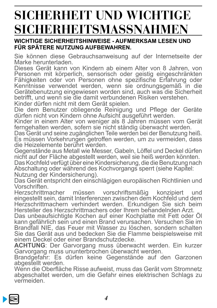 Réglage de la puissance12 Horizone ou duozone 12 Réglage de la minuterie12 Minuteur indépendant 13 Touche ELAPSED TIME13 Verrouillage des commandes 13 Fonction ICS14 Cet appareil peut être utilisé par des enfants âgés de 8 ans et plus et par des personnes ayant des capacités physiques, sensorielles ou mentales réduites ou des personnes sans expérience et connaissance, si elles ont été correctement informées ou formées à l’utilisation de l’appareil en toute sécurité et qu’elles en comprennent les risques qui en résultent. Les enfants ne doivent pas jouer avec l’appareil. Le nettoyage et l’entretien par l’usager ne doivent pas être effectués par des enfants sans surveillance. Les enfants de moins de 8 ans doivent être tenus à l’écart à moins qu’ils ne soient surveillés en permanence. L’appareil et ses parties accessibles deviennent chauds pendant l’utilisation. Des précautions doivent être prises pour éviter de toucher les éléments chauffants. Les objets métalliques tels que couteaux, fourchettes, cuillères et couvercles ne doivent pas être placés sur la surface, car ils peuvent devenir chauds. Votre table possède une sécurité enfant qui verrouille son utilisation à l’arrêt ou en cours de cuisson (voir chapitre: utilisation de la sécurité enfant). Votre appareil est conforme aux directives et réglementations européennes auxquelles il est soumis. Afin qu’il n’y ait pas d’interférences entre votre table de cuisson et un stimulateur cardiaque, ce dernier doit être conçu et réglé en conformité avec la réglementation qui le concerne. Renseignez vous auprès de son fabricant ou votre médecin traitant. Une cuisson avec de l’huile ou de la matière grasse effectuée sur une table, et sans surveillance peut être dangereuse et donner lieu à un incendie. Ne tentez JAMAIS d’éteindre un feu avec de l’eau, mais coupez l’alimentation de l’appareil avant de couvrir la flamme avec par exemple un couvercle ou une couverture anti feu. ATTENTION : la cuisson doit être surveillée. Une cuisson courte nécessite une surveillance continue. Risque d’incendie : ne pas stocker d’objets sur les zones de cuisson. Si la surface est fissurée, déconnecter l’appareil pour éviter le risque de choc électrique. 4