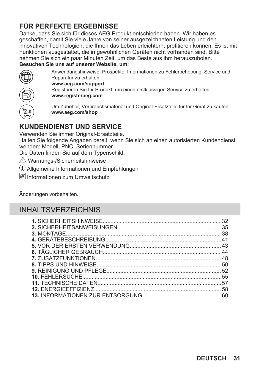 Obtenir des conseils d’utilisation, des brochures, un dépanneur, des informations sur le service et les réparations : www.aeg.com/support Enregistrer votre produit pour un meilleur service : www.registeraeg.com Acheter des accessoires, consommables et pièces de rechange d’origine pour votre appareil : www.aeg.com/shop