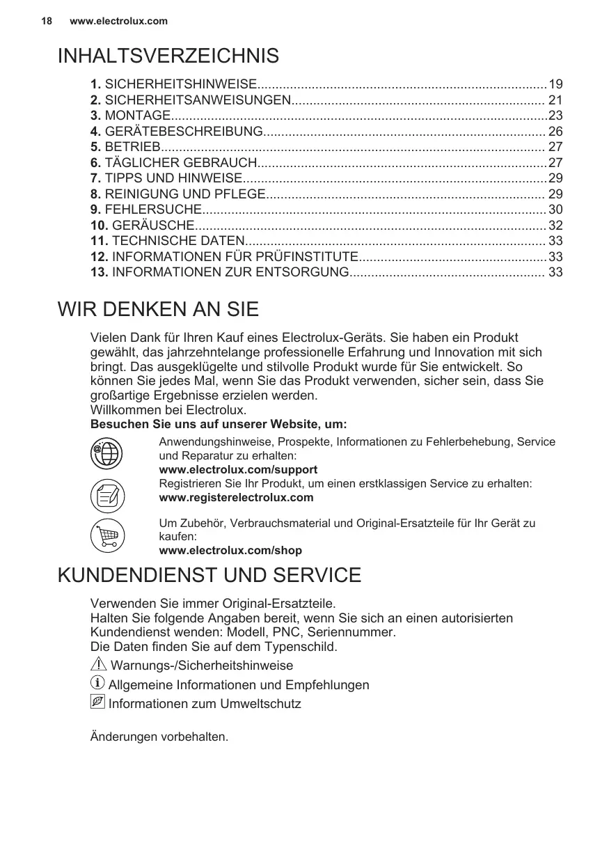 Vielen Dank für Ihren Kauf eines Electrolux-Geräts. Sie haben ein Produkt gewählt, das jahrzehntelange professionelle Erfahrung und Innovation mit sich bringt. Das ausgeklügelte und stilvolle Produkt wurde für Sie entwickelt. So können Sie jedes Mal, wenn Sie das Produkt verwenden, sicher sein, dass Sie großartige Ergebnisse erzielen werden. Willkommen bei Electrolux. Besuchen Sie uns auf unserer Website, um: Anwendungshinweise, Prospekte, Informationen zu Fehlerbehebung, Service und Reparatur zu erhalten: www.electrolux.com/support Registrieren Sie Ihr Produkt, um einen erstklassigen Service zu erhalten: www.registerelectrolux.com Um Zubehör, Verbrauchsmaterial und Original-Ersatzteile für Ihr Gerät zu kaufen: www.electrolux.com/shop