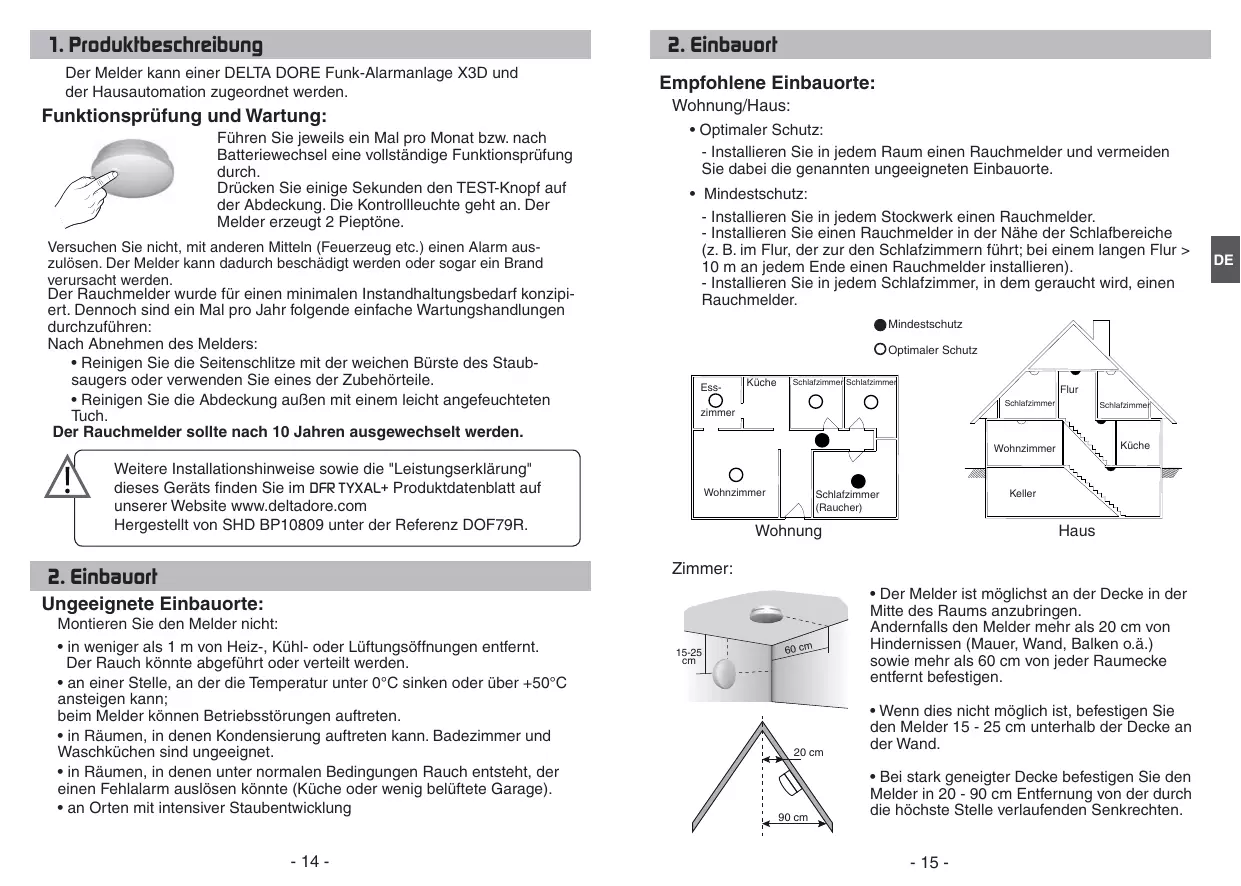 - Mindestschutz: - Installieren Sie in jedem Stockwerk einen Rauchmelder. - Installieren Sie einen Rauchmelder in der Nähe der Schlafbereiche (z. B. im Flur, der zur den Schlafzimmern führt; bei einem langen Flur > 10 m an jedem Ende einen Rauchmelder installieren). - Installieren Sie in jedem Schlafzimmer, in dem geraucht wird, einen Rauchmelder. Mindestschutz Optimaler Schutz Ess- Küche Schlafzimmer Schlafzimmer Flur Schlafzimmer Schlafzimmer Wohnzimmer Küche zimmer Weitere Installationshinweise sowie die "Leistungserklärung" dieses Geräts finden Sie im DFR TYXAL+ Produktdatenblatt auf unserer Website www.deltadore.com Hergestellt von SHD BP10809 unter der Referenz DOF79R. Wohnzimmer Keller Schlafzimmer (Raucher) Wohnung Haus Zimmer: