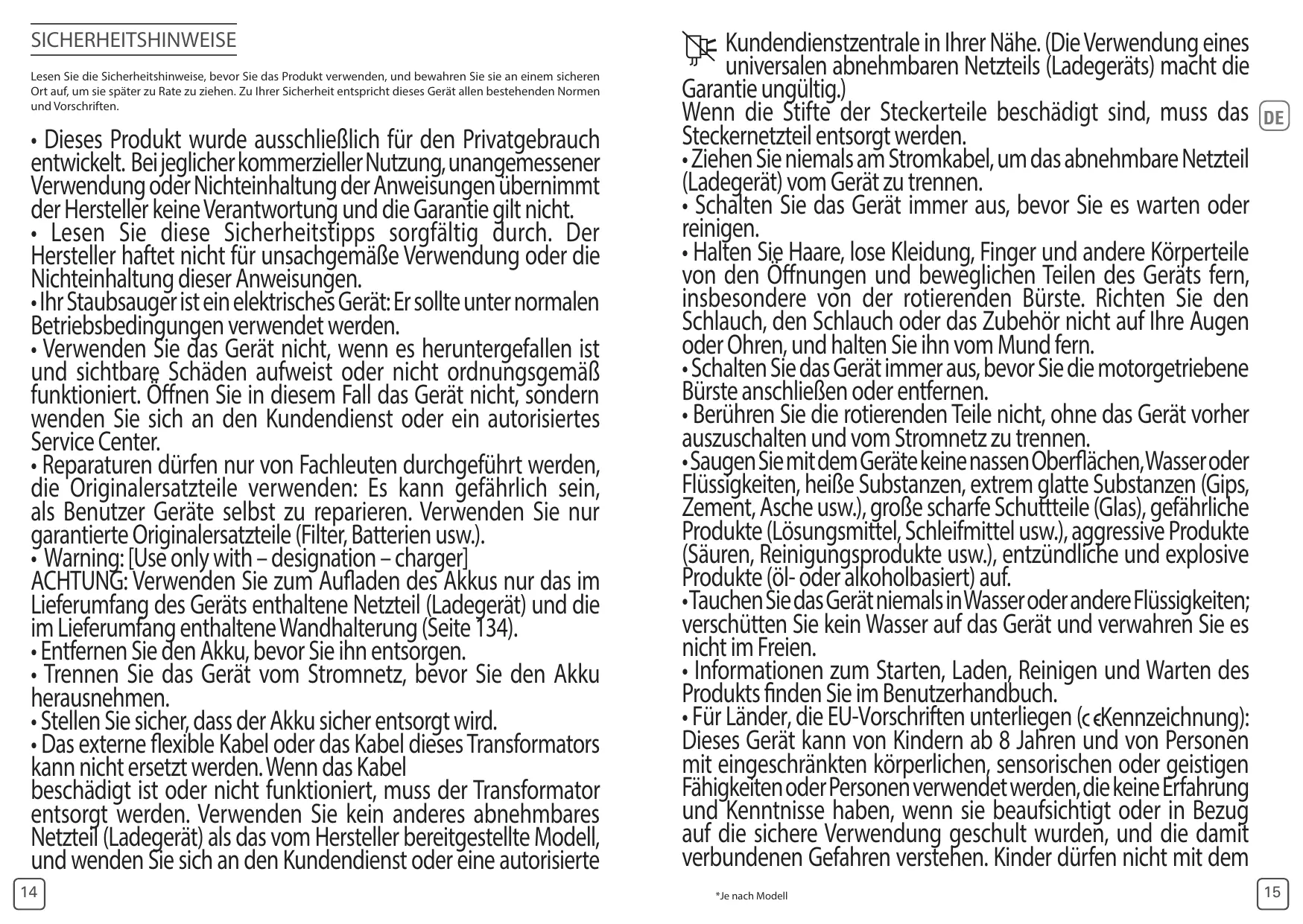 • Lisez attentivement ces conseils de sécurité. Une utilisation non appropriée ou non conforme au mode d’emploi dégagerait la marque de toute responsabilité. • Votre aspirateur est un appareil électrique : il doit être utilisé dans des conditions normales d’utilisation. • Ne pas utiliser l’appareil s’il est tombé et présente des détériorations visibles ou des anomalies de fonctionnement. Dans ce cas ne pas ouvrir l’appareil, mais l’envoyer au Centre Services agréés le plus proche de votre domicile, car des outils spéciaux sont nécessaires pour effectuer toute réparation afin d’éviter un danger. • Les réparations ne doivent être effectuées que par des spécialistes avec des pièces détachées d’origine : réparer un appareil soi-même peut constituer un danger pour l’utilisateur. N’utiliser que des accessoires garantis d’origine (filtres, batteries...). • Warning: [Use only with – designation – charger] MISE EN GARDE : Pour le rechargement de la batterie, utiliser uniquement l’unité d’alimentation amovible (chargeur) et sa fixation murale fournies avec l’appareil (page 134). • La batterie doit être retirée de l’appareil avant que celui-ci ne soit mis au rebus. • L’appareil doit être déconnecté du réseau d’alimentation lorsqu’on retire la batterie. • La batterie doit être éliminée de façon sûre. • Le câble ou le cordon flexible externe de ce transformateur ne peut être remplacé; si le cordon est endommagé ou ne fonctionne pas, le transformateur doit être mis au rebut : n’utilisez pas de bloc d’alimentation amovible (chargeur) autre que le modèle fourni par le fabricant et contactez le service clientèle ou votre centre de service agréé le plus proche (utilisation d’un bloc d’alimentation amovible universel ( chargeur) annule la garantie) 2