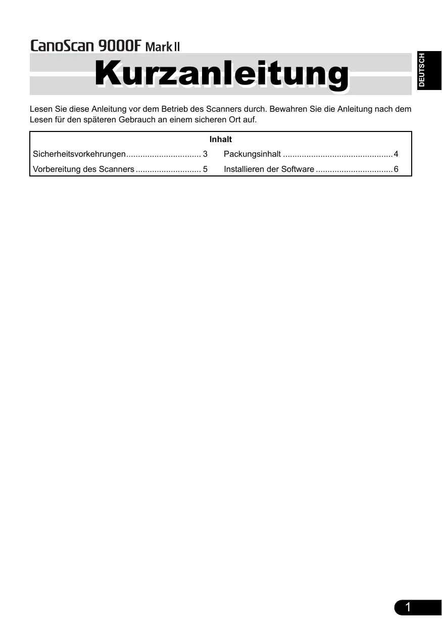 DEUTSCH Kurzanleitung Lesen Sie diese Anleitung vor dem Betrieb des Scanners durch. Bewahren Sie die Anleitung nach dem Lesen für den späteren Gebrauch an einem sicheren Ort auf. Inhalt Sicherheitsvorkehrungen 3