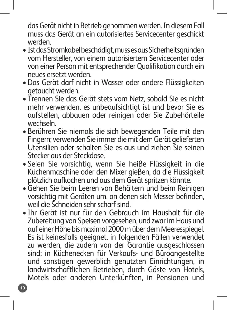 N’utilisez pas l’appareil si la prise ou le câble d’alimentation est endommagé. Si le câble d’alimentation est endommagé, il doit être remplacé par le fabricant, son service après-vente ou une personne de qualification similaire afin d’éviter tout danger. • S i le câble d’alimentation est endommagé, il doit être remplacé par le fabricant, son Centre Service Agréé ou une personne de qualification similaire afin d’éviter tout danger. • L’appareil ne doit pas être immergé dans l’eau ou tout autre liquide. • Débranchez toujours l’appareil de la prise électrique avant de le laisser sans surveillance, de le nettoyer ou de l’assembler / démonter. • Ne touchez jamais les parties en mouvement avec vos doigts, utilisez toujours les accessoires fournis avec l’appareil ou éteignez-le puis débranchez-le. • Restez vigilant(e) si un liquide chaud est versé dans le robot ménager ou le mixeur dans la mesure où il peut être éjecté de l’appareil en raison d’une ébullition soudaine. • Pour les appareils possédant un couteau, manipulez-le avec précaution, lorsque le contenant est vidé et lors du nettoyage car les lames sont très coupantes. • Votre appareil est destiné uniquement à un usage domestique culinaire, à l’intérieur de la maison et à une 4