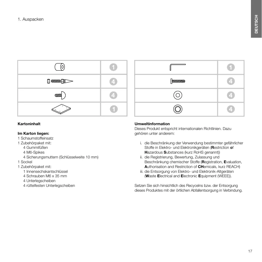 4 pieds en caoutchouc 4 pieds-pointes M6 4 écrous de blocage (10 mm) 1 support de sol 1 carton d’accessoires contenant : équipements électriques et électroniques, ii. l’enregistrement, l’évaluation, l’autorisation et la restriction des substances chimiques (REACH) iii l’élimination des déchets électriques et électroniques (WEEE). Consultez votre organisme local d’élimination des déchets pour des conseils sur la façon appropriée de recycler ou de jeter ce produit.