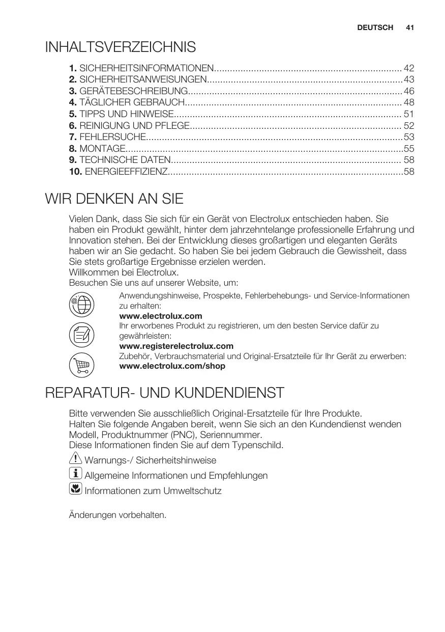 Vielen Dank, dass Sie sich für ein Gerät von Electrolux entschieden haben. Sie haben ein Produkt gewählt, hinter dem jahrzehntelange professionelle Erfahrung und Innovation stehen. Bei der Entwicklung dieses großartigen und eleganten Geräts haben wir an Sie gedacht. So haben Sie bei jedem Gebrauch die Gewissheit, dass Sie stets großartige Ergebnisse erzielen werden. Willkommen bei Electrolux. Besuchen Sie uns auf unserer Website, um: Anwendungshinweise, Prospekte, Fehlerbehebungs- und Service-Informationen zu erhalten: www.electrolux.com Ihr erworbenes Produkt zu registrieren, um den besten Service dafür zu gewährleisten: www.registerelectrolux.com Zubehör, Verbrauchsmaterial und Original-Ersatzteile für Ihr Gerät zu erwerben: www.electrolux.com/shop