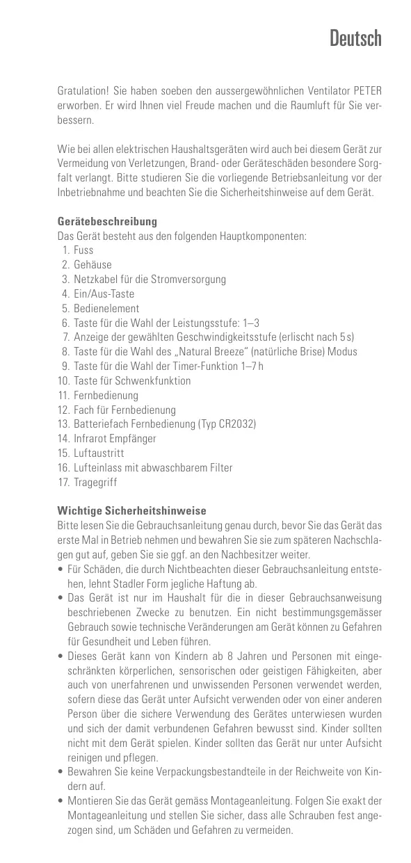 33–52 dB(A) CE / WEEE / RoHS / EAC All rights for any technical modifications are reserved Deutsch Gratulation! Sie haben soeben den aussergewöhnlichen Ventilator PETER erworben. Er wird Ihnen viel Freude machen und die Raumluft für Sie verbessern. Wie bei allen elektrischen Haushaltsgeräten wird auch bei diesem Gerät zur Vermeidung von Verletzungen, Brand- oder Geräteschäden besondere Sorgfalt verlangt. Bitte studieren Sie die vorliegende Betriebsanleitung vor der Inbetriebnahme und beachten Sie die Sicherheitshinweise auf dem Gerät. Gerätebeschreibung Das Gerät besteht aus den folgenden Hauptkomponenten: