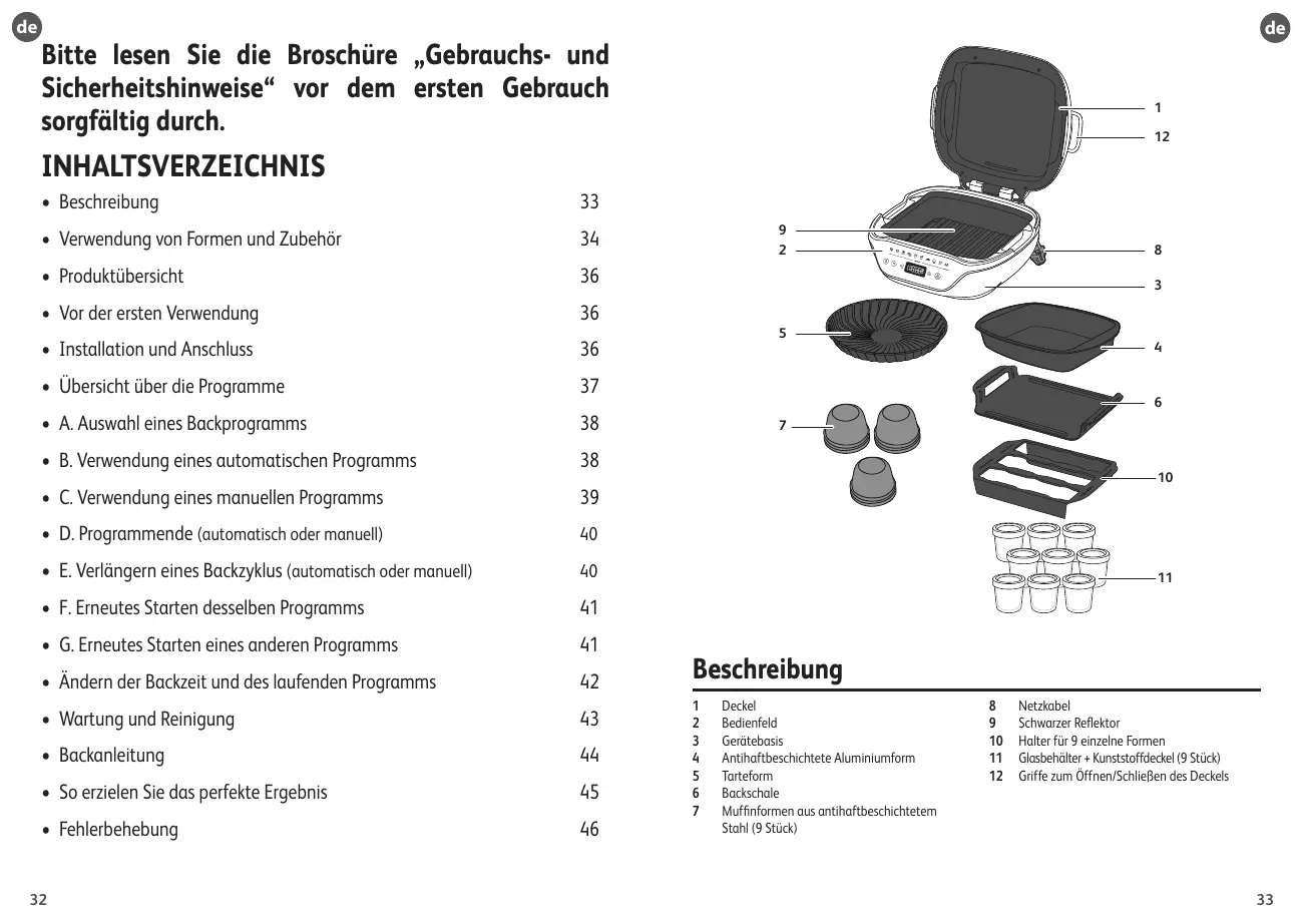 Sekunden, bevor Sie die Ein-/ Aus-Taste drücken. Das erste Programm blinkt und zeigt so den Modus „Programmauswahl“ an. 9 voreingestellte Programme: 1 Programm für Kuchen zum Teilen 2 Programm für einzelne Kuchen 3 Programm für Lava kuchen 4 Programm für Baiser 5 Programm für Sahnepudding