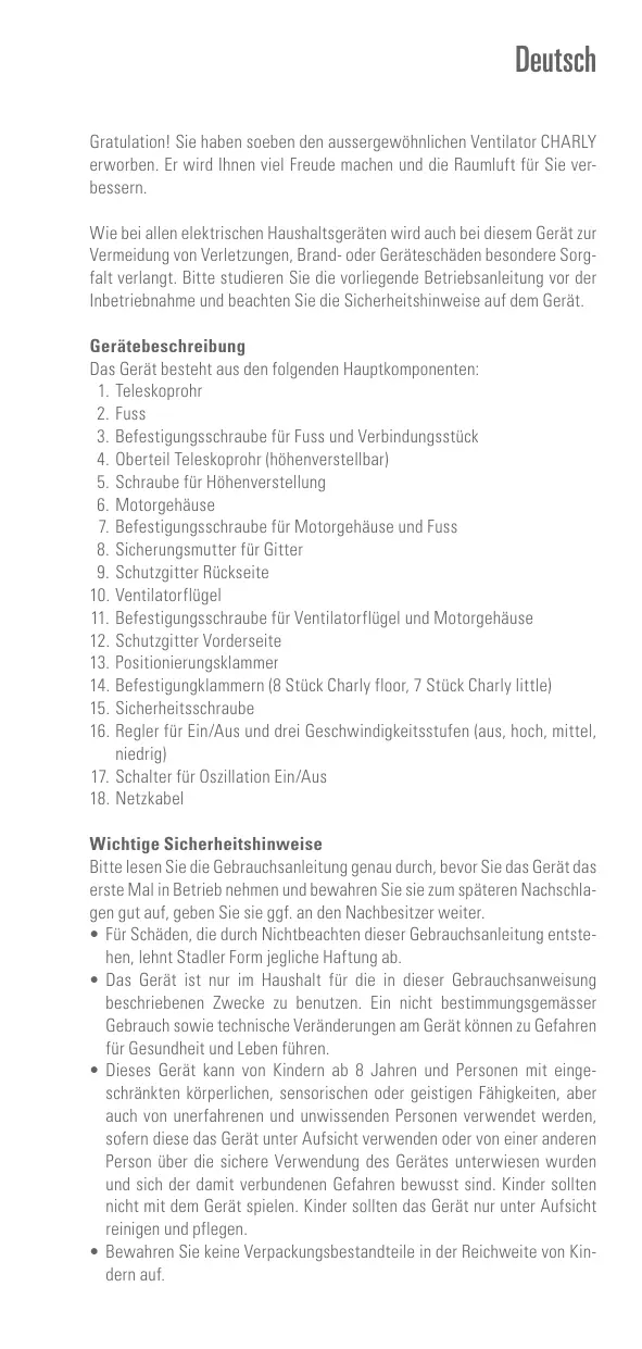 Charly Stand K - Ventilator STADLER FORM - Kostenlose Bedienungsanleitung