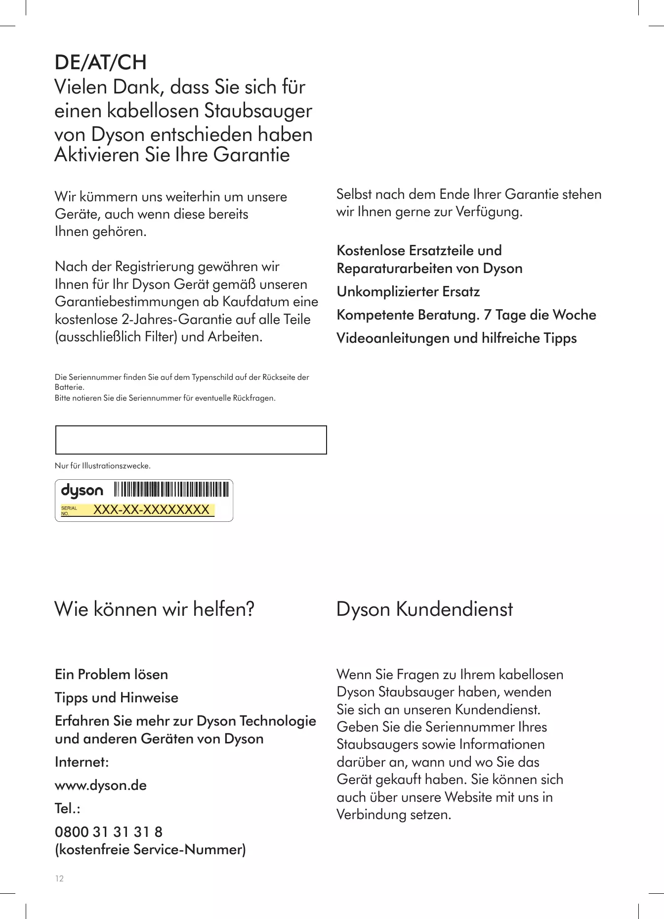 Une fois que vous vous aurez enregistré la garantie de 2 ans, votre appareil Dyson sera couvert pour les pièces et la main-d’œuvre pendant 2 ans à compter de la date d’achat, conformément aux conditions de garantie. Si vous avez la moindre question concernant votre appareil Dyson, consultez le site www.dyson.fr/support (FR), www.dyson.be/support (BE) ou www.dyson.ch/support (CH) pour obtenir une aide en ligne, des conseils généraux et des informations utiles sur Dyson. Vous pouvez également appeler le Service consommateurs Dyson et lui communiquer le numéro de série de l’appareil et les détails concernant la date/le lieu d’achat. Si votre appareil Dyson a besoin d’être réparé, appelez le Service Consommateurs Dyson afin de discuter des différentes options disponibles. Si votre appareil Dyson est sous garantie et que la réparation est couverte, elle sera gratuite. Enregistrez-vous comme propriétaire d’un appareil dyson La garantie pour ce produit est de 2 ans à compter de la date d’achat. Veuillez enregistrer votre produit pour activer votre garantie dans les 30 jours suivant la date d’achat. Pour nous aider à garantir un service rapide et efficace, veuillez vous enregistrer immédiatement après l’achat. Veuillez conserver la facture indiquant la date et le lieu d'achat. Vous pouvez activer votre garantie de trois manières : • En ligne à l’adresse www.dyson.fr • En contactant le Service Consommateurs Dyson au 0800 94 58 01. • En remplissant le formulaire joint et en le renvoyant. En vous enregistrant en ligne ou par téléphone, vous : • Sécurisez votre achat avec la garantie de 2 ans sur les pièces et la main d’œuvre; • Recevez des conseils utiles sur l’utilisation de votre appareil ; • Bénéficiez de conseils experts de la part du Service consommateurs Dyson ; • Etre le premier au courant des dernières innovations. • S'enregistrer en ligne ne prend que quelques minutes et vous avez uniquement besoin du numéro de série. Garantie limitée de 2 ans Les modalités de la garantie limitée de 2 ans de Dyson sont énoncées ci-dessous. Le nom et l'adresse du garant Dyson pour votre pays sont énoncés ailleurs dans ce document (veuillez vous reporter au tableau indiquant ces informations). Ce qui est couvert • La réparation ou le remplacement de votre appareil Dyson (à l’entière discrétion de Dyson) s’il présente un défaut matériel, de fabrication ou de fonctionnement dans les 2 ans à compter de la date d’achat ou de livraison. (Si une pièce n’est plus disponible ou fabriquée, Dyson la remplacera par une pièce fonctionnelle équivalente.) • Lorsque l’appareil est vendu en dehors de l’UE, cette garantie n’est valable que si l’appareil est utilisé dans le pays dans lequel il a été vendu. • Lorsque cet appareil est vendu au sein de l'UE, cette garantie n’est valable que (i) si l'appareil est utilisé dans le pays dans lequel il a été vendu ou (ii) si l'appareil est utilisé en Allemagne, en Autriche, en Belgique, au Danemark, en Espagne, en Finlande, en France, en Irlande, en Italie, en Norvège, aux Pays-Bas, en Pologne, au RoyaumeUni, en Suède ou en Suisse et si le même modèle est vendu à la même tension nominale dans ce pays. Ce qui n’est pas couvert Dyson ne garantit pas la réparation ni le remplacement d’un produit si le défaut est dû à : • Des dommages accidentels ou des défauts causés par une mauvaise utilisation, un entretien incorrect, une utilisation abusive, une négligence, ou une utilisation ou manipulation non conforme aux instructions du mode d’emploi Dyson. • Une utilisation de l’appareil à une fin autre que des travaux ménagers ordinaires. • Une utilisation de pièces non assemblées ou installées conformément aux instructions de Dyson. • Une utilisation de pièces et accessoires autres que Dyson. • Une erreur d’installation (sauf en cas d’installation par Dyson). • Des réparations ou modifications effectuées par des personnes autres que Dyson ou ses agents agréés. • Obstructions : veuillez vous référer aux informations disponibles dans votre manuel d’utilisation concernant la recherche et l'élimination des obstructions. • Une usure normale (par ex. fusible, brosse, etc.). • une utilisation de l’appareil sur des gravats, des cendres ou du plâtre • une baisse de l’autonomie de la batterie liée à son âge ou à son utilisation (le cas échéant) En cas de doute sur les éléments couverts par votre garantie, veuillez contacter le Service consommateurs Dyson. Résumé de la garantie • La garantie prend effet à la date d’achat (ou à la date de livraison si celle-ci est postérieure à la date d’achat). • Pour qu’une intervention puisse être réalisée sur votre appareil Dyson, vous devez fournir la preuve d’achat/de livraison (document original et tout document ultérieur). Sans cette preuve, toute intervention sera à votre charge. Veuillez conserver votre reçu ou bon de livraison. • Toute réparation sera effectuée par Dyson ou l’un de ses agents agréés. • Toutes les pièces remplacées par Dyson deviennent la propriété de Dyson. • La réparation ou le remplacement sous garantie de votre appareil Dyson ne prolonge pas la période de garantie, à moins que cela ne soit exigé par la législation locale du pays d'achat. • La garantie offre des avantages qui viennent s'ajouter à vos droits légaux en tant que consommateur, sans affecter ceux-ci. En outre, cette garantie s'appliquera que vous ayez acheté votre produit directement auprès de Dyson ou auprès d'un tiers. Informations importantes concernant la protection des données Lors de l’enregistrement de votre appareil Dyson : • Vous devez nous fournir des coordonnées de base pour pouvoir enregistrer votre appareil et nous permettre de vous offrir la garantie. • Lors de votre enregistrement, vous aurez la possibilité d’i