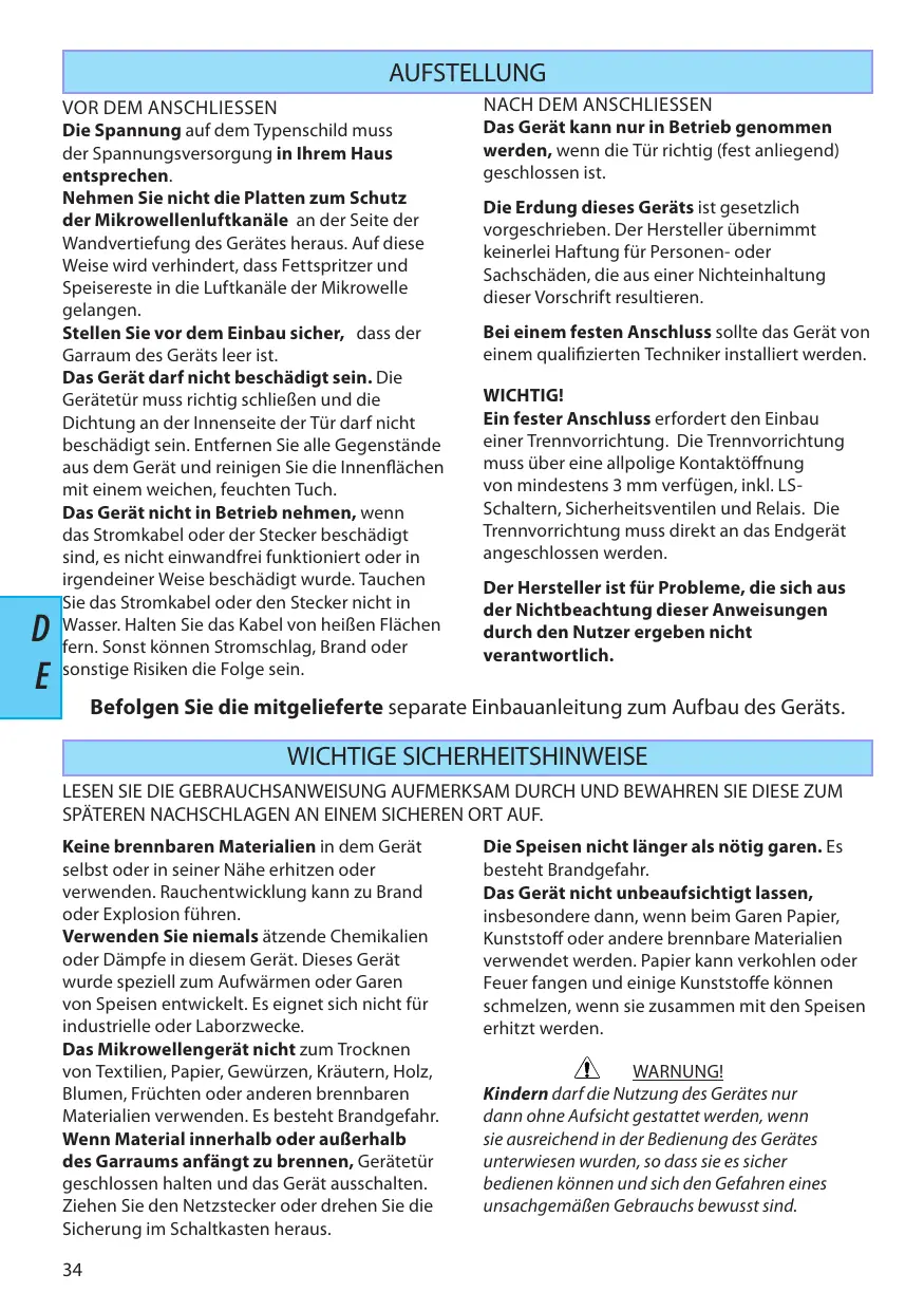 Die Spannung auf dem Typenschild muss der Spannungsversorgung in Ihrem Haus entsprechen. Nehmen Sie nicht die Platten zum Schutz der Mikrowellenluftkanäle an der Seite der Wandvertiefung des Gerätes heraus. Auf diese Weise wird verhindert, dass Fettspritzer und Speisereste in die Luftkanäle der Mikrowelle gelangen. Stellen Sie vor dem Einbau sicher, dass der Garraum des Geräts leer ist. Das Gerät darf nicht beschädigt sein. Die Gerätetür muss richtig schließen und die Dichtung an der Innenseite der Tür darf nicht beschädigt sein. Entfernen Sie alle Gegenstände aus dem Gerät und reinigen Sie die Innenflächen mit einem weichen, feuchten Tuch. Das Gerät nicht in Betrieb nehmen, wenn das Stromkabel oder der Stecker beschädigt sind, es nicht einwandfrei funktioniert oder in irgendeiner Weise beschädigt wurde. Tauchen Sie das Stromkabel oder den Stecker nicht in Wasser. Halten Sie das Kabel von heißen Flächen fern. Sonst können Stromschlag, Brand oder sonstige Risiken die Folge sein. Das Gerät kann nur in Betrieb genommen werden, wenn die Tür richtig (fest anliegend) geschlossen ist. Die Erdung dieses Geräts ist gesetzlich vorgeschrieben. Der Hersteller übernimmt keinerlei Haftung für Personen- oder Sachschäden, die aus einer Nichteinhaltung dieser Vorschrift resultieren. Bei einem festen Anschluss sollte das Gerät von einem qualifizierten Techniker installiert werden. WICHTIG! Ein fester Anschluss erfordert den Einbau einer Trennvorrichtung. Die Trennvorrichtung muss über eine allpolige Kontaktöffnung von mindestens 3 mm verfügen, inkl. LSSchaltern, Sicherheitsventilen und Relais. Die Trennvorrichtung muss direkt an das Endgerät angeschlossen werden. Der Hersteller ist für Probleme, die sich aus der Nichtbeachtung dieser Anweisungen durch den Nutzer ergeben nicht verantwortlich. Befolgen Sie die mitgelieferte separate Einbauanleitung zum Aufbau des Geräts. WICHTIGE SICHERHEITSHINWEISE LESEN SIE DIE GEBRAUCHSANWEISUNG AUFMERKSAM DURCH UND BEWAHREN SIE DIESE ZUM SPÄTEREN NACHSCHLAGEN AN EINEM SICHEREN ORT AUF. Keine brennbaren Materialien in dem Gerät selbst oder in seiner Nähe erhitzen oder verwenden. Rauchentwicklung kann zu Brand oder Explosion führen. Verwenden Sie niemals ätzende Chemikalien oder Dämpfe in diesem Gerät. Dieses Gerät wurde speziell zum Aufwärmen oder Garen von Speisen entwickelt. Es eignet sich nicht für industrielle oder Laborzwecke. Das Mikrowellengerät nicht zum Trocknen von Textilien, Papier, Gewürzen, Kräutern, Holz, Blumen, Früchten oder anderen brennbaren Materialien verwenden. Es besteht Brandgefahr. Wenn Material innerhalb oder außerhalb des Garraums anfängt zu brennen, Gerätetür geschlossen halten und das Gerät ausschalten. Ziehen Sie den Netzstecker oder drehen Sie die Sicherung im Schaltkasten heraus.