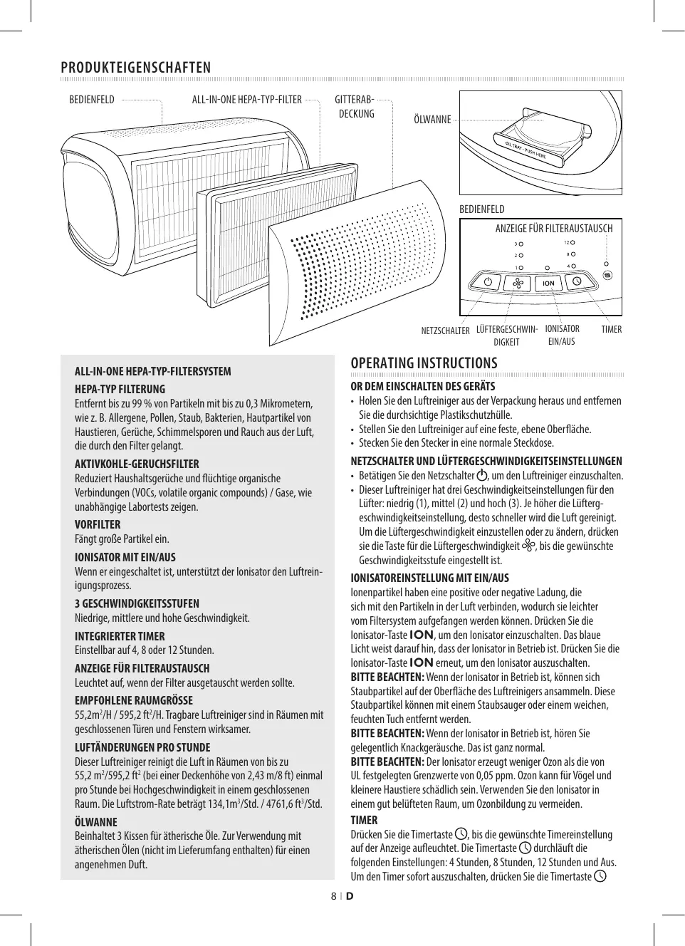 TIMER OPERATING INSTRUCTIONS OR DEM EINSCHALTEN DES GERÄTS • Holen Sie den Luftreiniger aus der Verpackung heraus und entfernen Sie die durchsichtige Plastikschutzhülle. • Stellen Sie den Luftreiniger auf eine feste, ebene Oberfläche. • Stecken Sie den Stecker in eine normale Steckdose. NETZSCHALTER UND LÜFTERGESCHWINDIGKEITSEINSTELLUNGEN • Betätigen Sie den Netzschalter , um den Luftreiniger einzuschalten. • Dieser Luftreiniger hat drei Geschwindigkeitseinstellungen für den Lüfter: niedrig (1), mittel (2) und hoch (3). Je höher die Lüftergeschwindigkeitseinstellung, desto schneller wird die Luft gereinigt. Um die Lüftergeschwindigkeit einzustellen oder zu ändern, drücken sie die Taste für die Lüftergeschwindigkeit , bis die gewünschte Geschwindigkeitsstufe eingestellt ist. IONISATOREINSTELLUNG MIT EIN/AUS Ionenpartikel haben eine positive oder negative Ladung, die sich mit den Partikeln in der Luft verbinden, wodurch sie leichter vom Filtersystem aufgefangen werden können. Drücken Sie die Ionisator-Taste ION, um den Ionisator einzuschalten. Das blaue Licht weist darauf hin, dass der Ionisator in Betrieb ist. Drücken Sie die Ionisator-Taste ION erneut, um den Ionisator auszuschalten. BITTE BEACHTEN: Wenn der Ionisator in Betrieb ist, können sich Staubpartikel auf der Oberfläche des Luftreinigers ansammeln. Diese Staubpartikel können mit einem Staubsauger oder einem weichen, feuchten Tuch entfernt werden. BITTE BEACHTEN: Wenn der Ionisator in Betrieb ist, hören Sie gelegentlich Knackgeräusche. Das ist ganz normal. BITTE BEACHTEN: Der Ionisator erzeugt weniger Ozon als die von UL festgelegten Grenzwerte von 0,05 ppm. Ozon kann für Vögel und kleinere Haustiere schädlich sein. Verwenden Sie den Ionisator in einem gut belüfteten Raum, um Ozonbildung zu vermeiden. TIMER Drücken Sie die Timertaste , bis die gewünschte Timereinstellung auf der Anzeige aufleuchtet. Die Timertaste durchläuft die folgenden Einstellungen: 4 Stunden, 8 Stunden, 12 Stunden und Aus. Um den Timer sofort auszuschalten, drücken Sie die Timertaste 8ID