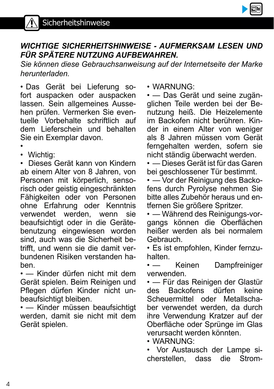 Sur la porte ouverte du four, ne posez pas de charges lourdes, et assurez vous qu’un enfant ne puisse ni monter ni s’asseoir. Ne vous servez pas de votre four comme garde-manger ou pour stocker quelconques éléments après utilisation. Après utilisation de votre four, assurez-vous que toutes les commandes se trouvent sur la position arrêt. Pour toute intervention de nettoyage dans la cavité du four, le four doit être arrêté. Avant de procéder au déclippage de la glace, laissez refroidir l’appareil.