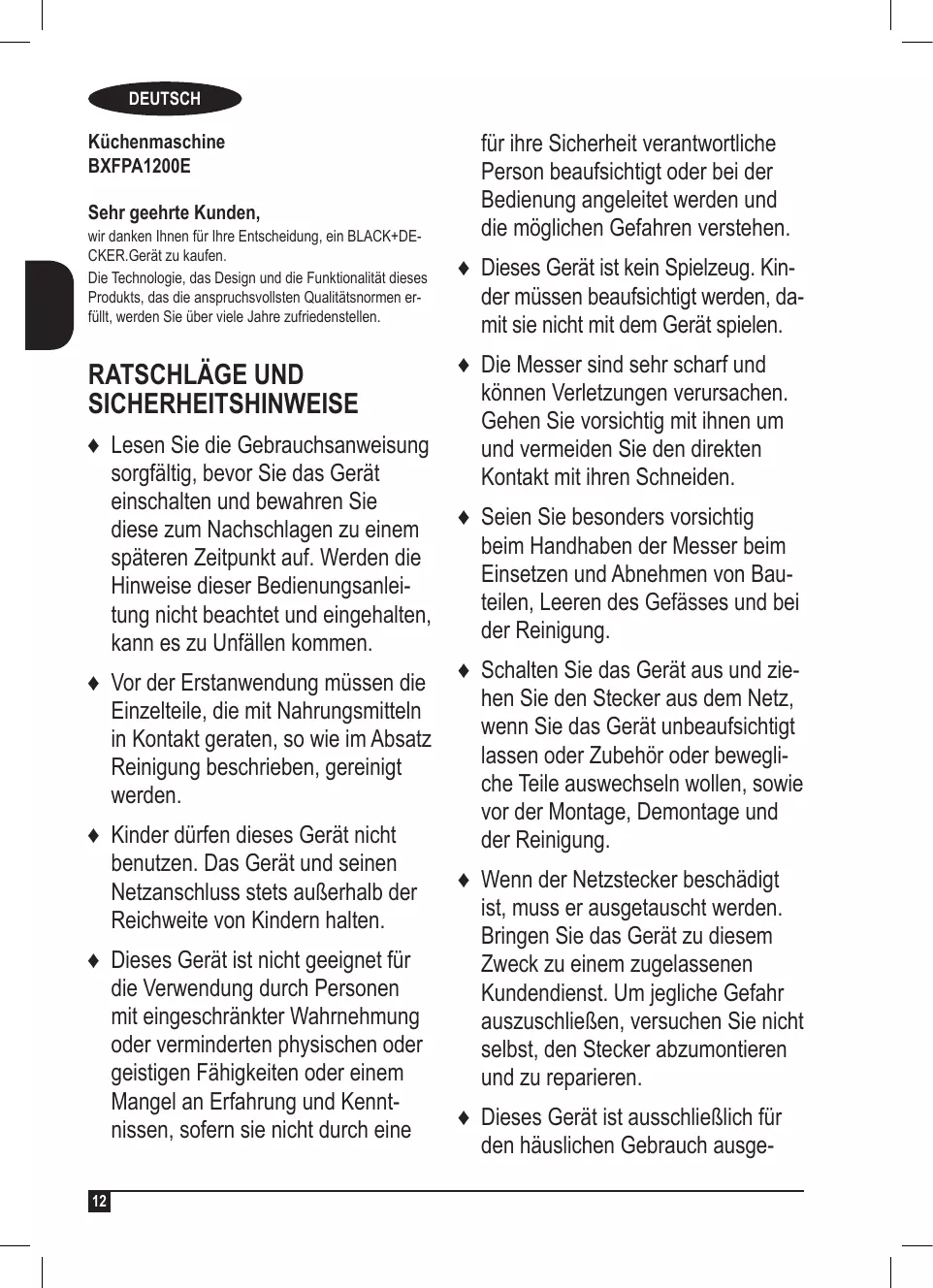 DEUTSCH Küchenmaschine BXFPA1200E Sehr geehrte Kunden,