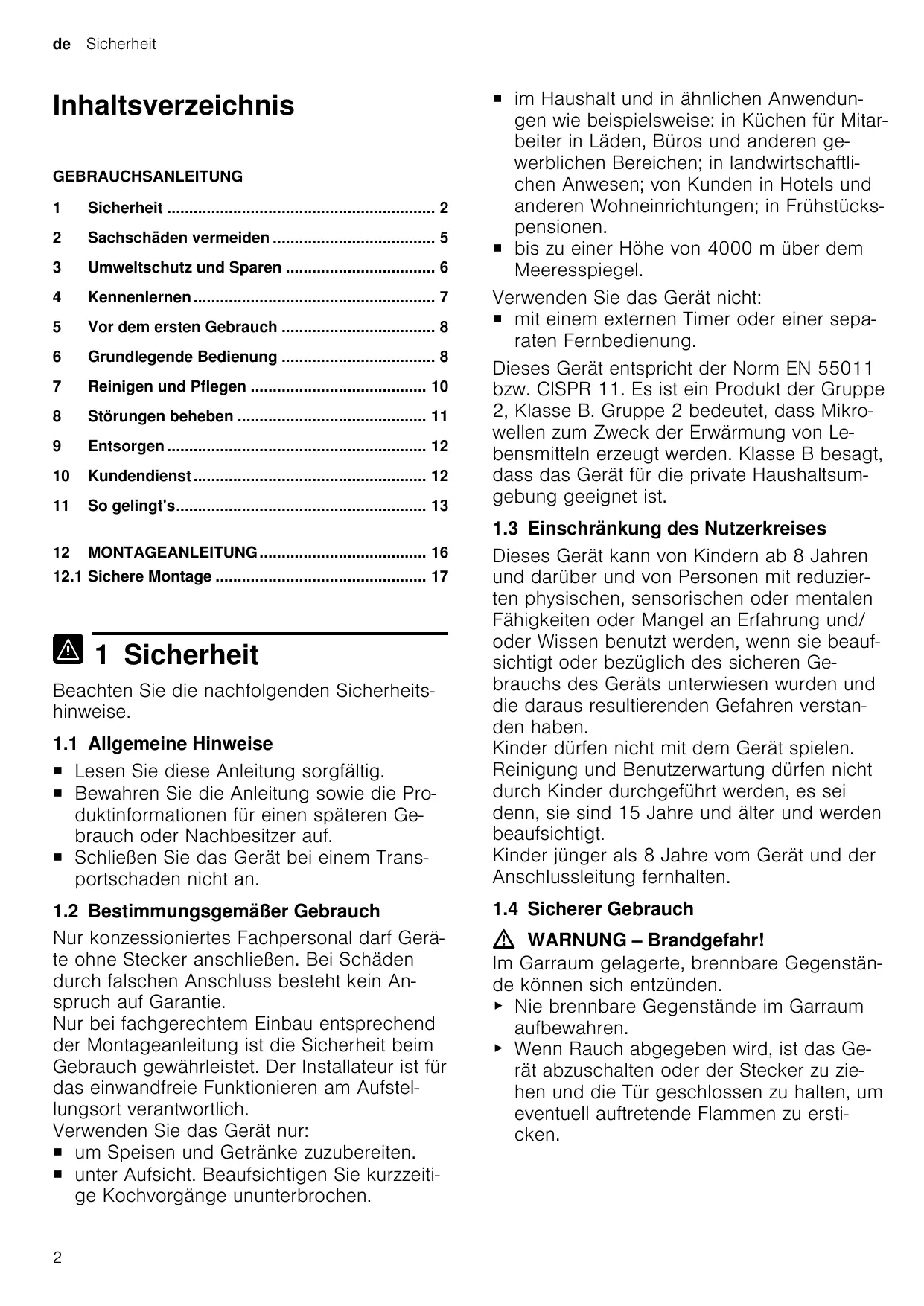 ¡ dans un usage domestique et similaire tel que : dans les cuisines pour le personnel de magasins, bureaux et autres secteurs professionnels ; dans les exploitations agricoles ; par les clients des hôtels et autres établissements résidentiels ; dans les pensions servent le petit-déjeuner. ¡ à une hauteur maximale de 4000 m audessus du niveau de la mer. N’utilisez pas l’appareil : ¡ avec une minuterie externe ou une télécommande séparée. Cet appareil est conforme à la norme EN 55011 ou CISPR 11. Il s'agit d'un produit du groupe 2, classe B. « Groupe 2 » signifie que des micro-ondes sont générées pour chauffer des aliments. « Classe B » signifie que l'appareil est adapté à un environnement domestique privé. 1.3 Restrictions du périmètre utilisateurs Les enfants de 8 ans et plus, les personnes souffrant d’un handicap physique, sensoriel ou mental ou ne détenant pas l’expérience et/ ou les connaissances nécessaires pourront utiliser cet appareil à condition de le faire sous surveillance, ou que son utilisation sûre leur ait été enseignée et qu’ils aient compris les dangers qui en émanent. Les enfants ne sont pas autorisés à jouer avec l'appareil. Les enfants ne doivent en aucun cas s’occuper du nettoyage et de la maintenance utilisateur, sauf s’ils sont âgés de 15 ans et plus et agissent sous surveillance. Les enfants de moins de 8 ans doivent être tenus à distance de l’appareil et du cordon d’alimentation secteur. 1.4 Utilisation sûre AVERTISSEMENT ‒ Risque d'incendie ! Les objets inflammables stockés dans le compartiment de cuisson peuvent prendre feu. ▶ N'entreposez jamais d'objets inflammables dans le compartiment de cuisson. ▶ En cas d'émission de fumée, éteignez l'appareil ou débranchez la prise et gardez la porte fermée pour éteindre les flammes qui pourraient être présentes.