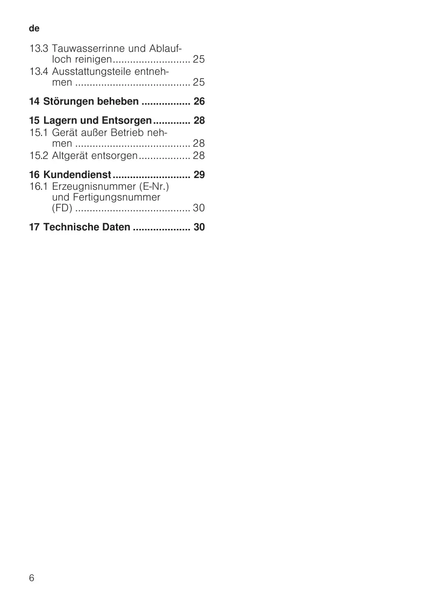 13.3 Tauwasserrinne und Ablaufloch reinigen 25 13.4 Ausstattungsteile entnehmen 25 14 Störungen beheben 26 15 Lagern und Entsorgen 28 15.1 Gerät außer Betrieb nehmen 28 15.2 Altgerät entsorgen 28 16 Kundendienst 29 16.1 Erzeugnisnummer (E-Nr.) und Fertigungsnummer (FD) 30 17 Technische Daten 30