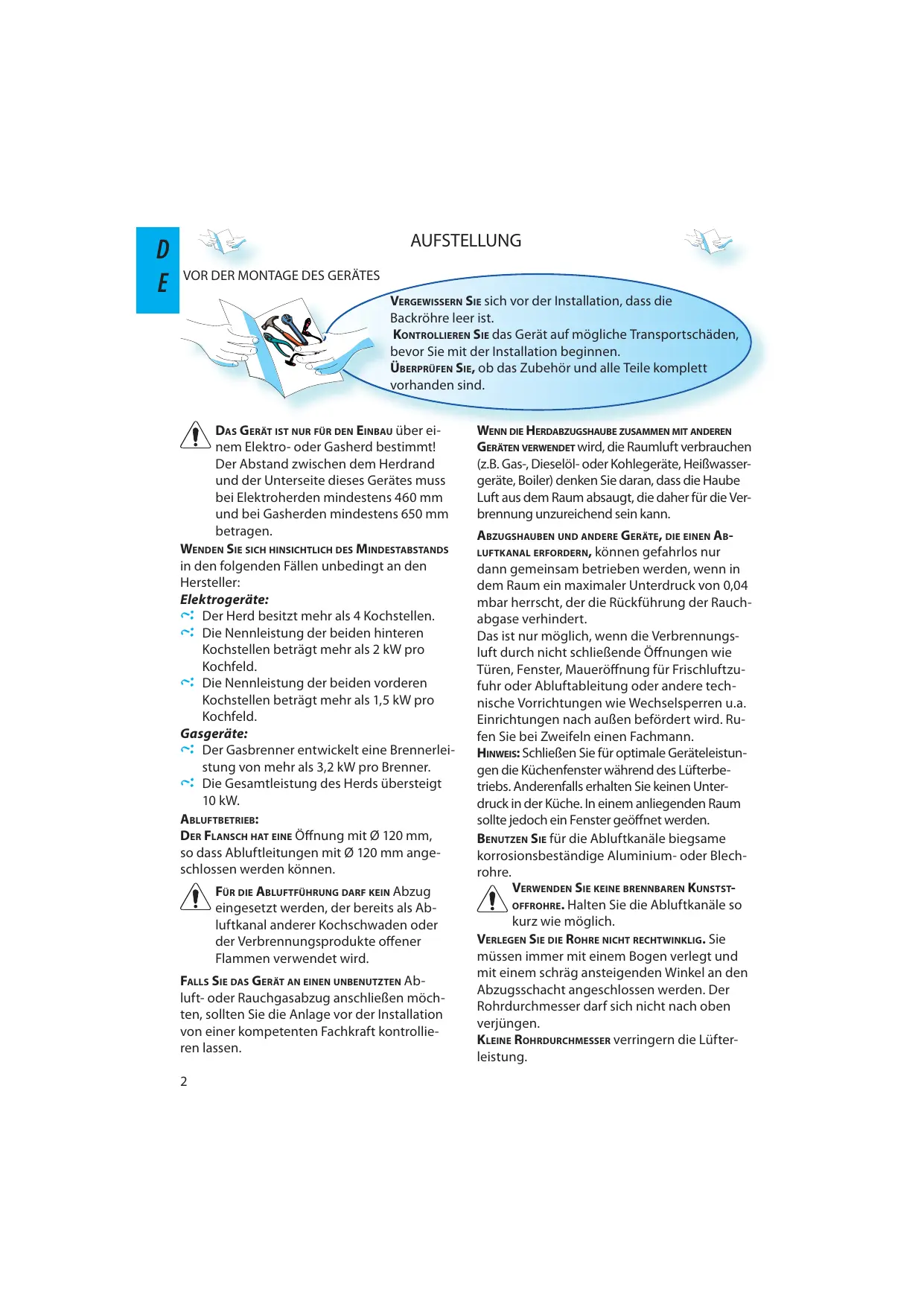 in den folgenden Fällen unbedingt an den Hersteller: Elektrogeräte: Der Herd besitzt mehr als 4 Kochstellen. Die Nennleistung der beiden hinteren Kochstellen beträgt mehr als 2 kW pro Kochfeld. Die Nennleistung der beiden vorderen Kochstellen beträgt mehr als 1,5 kW pro Kochfeld. Gasgeräte: Der Gasbrenner entwickelt eine Brennerleistung von mehr als 3,2 kW pro Brenner. Die Gesamtleistung des Herds übersteigt 10 kW. ABLUFTBETRIEB: DER FLANSCH HAT EINE Öffnung mit Ø 120 mm, so dass Abluftleitungen mit Ø 120 mm angeschlossen werden können.