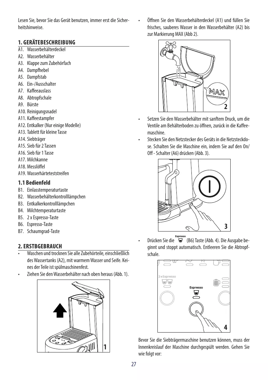 Posizionare il filtro tazze (A15) o (A16) nel portafiltro (A14) Se si attiva accidentalmente la funzione decalcificazione, è possibile interromperla tenendo premuto il tasto (B6) per almeno 10 secondi.