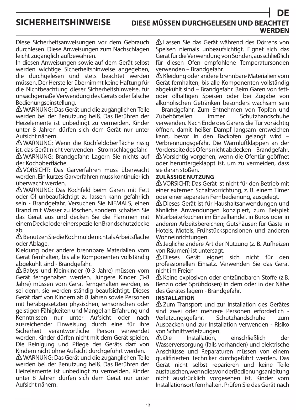 AVERTISSEMENT : L'appareil et ses pièces accessibles deviennent chauds pendant l'utilisation. Évitez tout contact avec les éléments chauffants. Les enfants de moins de 8 ans doivent rester éloignés sauf s'ils sont surveillés en continu. AVERTISSEMENT : Ne pas utiliser la table de cuisson si la surface est cassée ou fissurée - risque de choc électrique. AVERTISSEMENT : Risque d'incendie : Ne rangez aucun objet sur les surfaces de cuisson. MISE EN GARDE : La cuisson doit être supervisée. Une cuisson de courte durée doit être supervisée en tout temps. AVERTISSEMENT : Une cuisson sans surveillance sur une table de cuisson contenant de la graisse ou de l'huile peut s'avérer dangereuse - risque d'incendie. N'essayez JAMAIS d'éteindre un feu avec de l'eau, mais éteignez l'appareil puis couvrez les flammes à l'aide d'un couvercle par ex. ou d'une couverture antifeu. N'utilisez pas la table de cuisson comme surface de travail ou support. Gardez les vêtements et autres matières inflammables loin de l’appareil jusqu’à ce que toutes les composantes soient complètement refroidies un incendie pourrait se déclarer. Les enfants en bas âge (0-3 ans) doivent être tenus à l’écart de l’appareil. Les jeunes enfants (3-8 ans) doivent rester éloignés de l'appareil sauf s'ils sont surveillés en continu. Les enfants à partir de 8 ans et les personnes présentant des capacités physiques, sensorielles ou mentales réduites ou un manque d'expérience et de connaissances peuvent utiliser cet appareil uniquement s'ils sont surveillés ou ont reçu des instructions sur l'utilisation en toute sécurité et s'ils comprennent les risques impliqués. Les enfants ne doivent pas jouer avec l’appareil. Le nettoyage et l'entretien par l'utilisateur ne doivent pas être réalisés par des enfants sans surveillance. AVERTISSEMENT : L'appareil, ainsi que ses parties accessibles, peuvent atteindre température élevée lors de l'utilisation. Veillez à ne pas toucher les éléments chauffants. Les enfants de moins de 8 ans doivent être tenus à l'écart de l'appareil, à moins d'être sous surveillance constante.