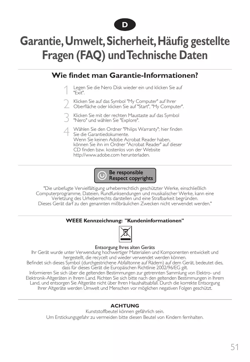 8x on DVD+RW 16x on DVD-R 4x on DVD-R Dual Layer 6x on DVD-RW The actual write speed may be lower as this is disc dependent. Maximum read speeds: 48x on CD 16x on DVD The SPD3000CC reads following discs: CD / CD-R / CD-RW formats both 8cm & 12cm discs (up to 99 min). Cliquez avec le bouton droit sur l’icône "Nero" et choisissez "Explorer". Choisissez le dossier "Philips Warranty" : vous y trouverez les documents relatifs à la garantie. Si vous n'avez pas Adobe Acrobat Reader, vous le trouverez dans le dossier Acrobat Reader de ce disque. Il est également disponible gratuitement à l'adresse http://www.adobe.com.