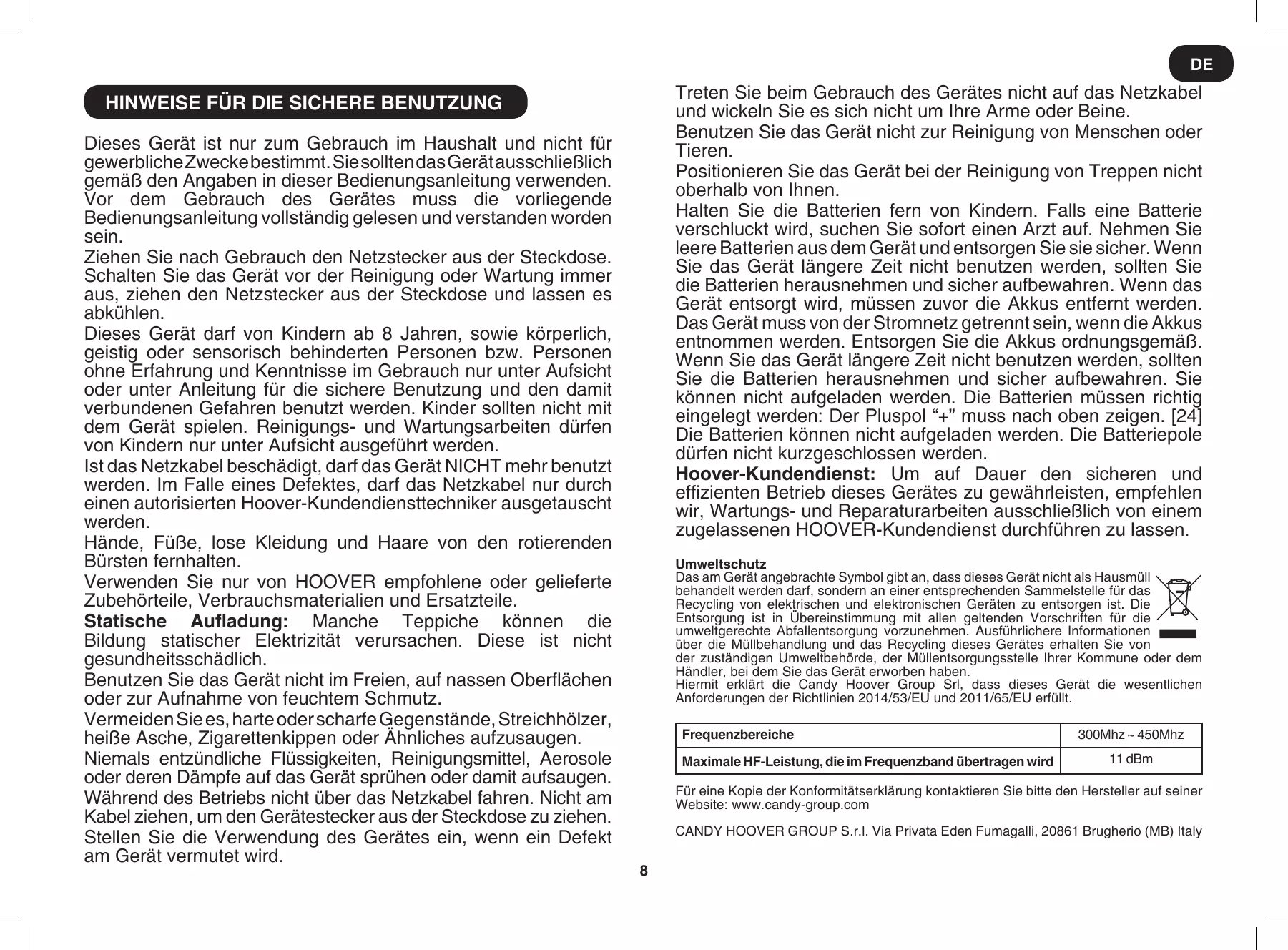 DE Treten Sie beim Gebrauch des Gerätes nicht auf das Netzkabel und wickeln Sie es sich nicht um Ihre Arme oder Beine. Benutzen Sie das Gerät nicht zur Reinigung von Menschen oder Tieren. Positionieren Sie das Gerät bei der Reinigung von Treppen nicht oberhalb von Ihnen. Halten Sie die Batterien fern von Kindern. Falls eine Batterie verschluckt wird, suchen Sie sofort einen Arzt auf. Nehmen Sie leere Batterien aus dem Gerät und entsorgen Sie sie sicher. Wenn Sie das Gerät längere Zeit nicht benutzen werden, sollten Sie die Batterien herausnehmen und sicher aufbewahren. Wenn das Gerät entsorgt wird, müssen zuvor die Akkus entfernt werden. Das Gerät muss von der Stromnetz getrennt sein, wenn die Akkus entnommen werden. Entsorgen Sie die Akkus ordnungsgemäß. Wenn Sie das Gerät längere Zeit nicht benutzen werden, sollten Sie die Batterien herausnehmen und sicher aufbewahren. Sie können nicht aufgeladen werden. Die Batterien müssen richtig eingelegt werden: Der Pluspol “+” muss nach oben zeigen. [24] Die Batterien können nicht aufgeladen werden. Die Batteriepole dürfen nicht kurzgeschlossen werden. Hoover-Kundendienst: Um auf Dauer den sicheren und effizienten Betrieb dieses Gerätes zu gewährleisten, empfehlen wir, Wartungs- und Reparaturarbeiten ausschließlich von einem zugelassenen HOOVER-Kundendienst durchführen zu lassen.