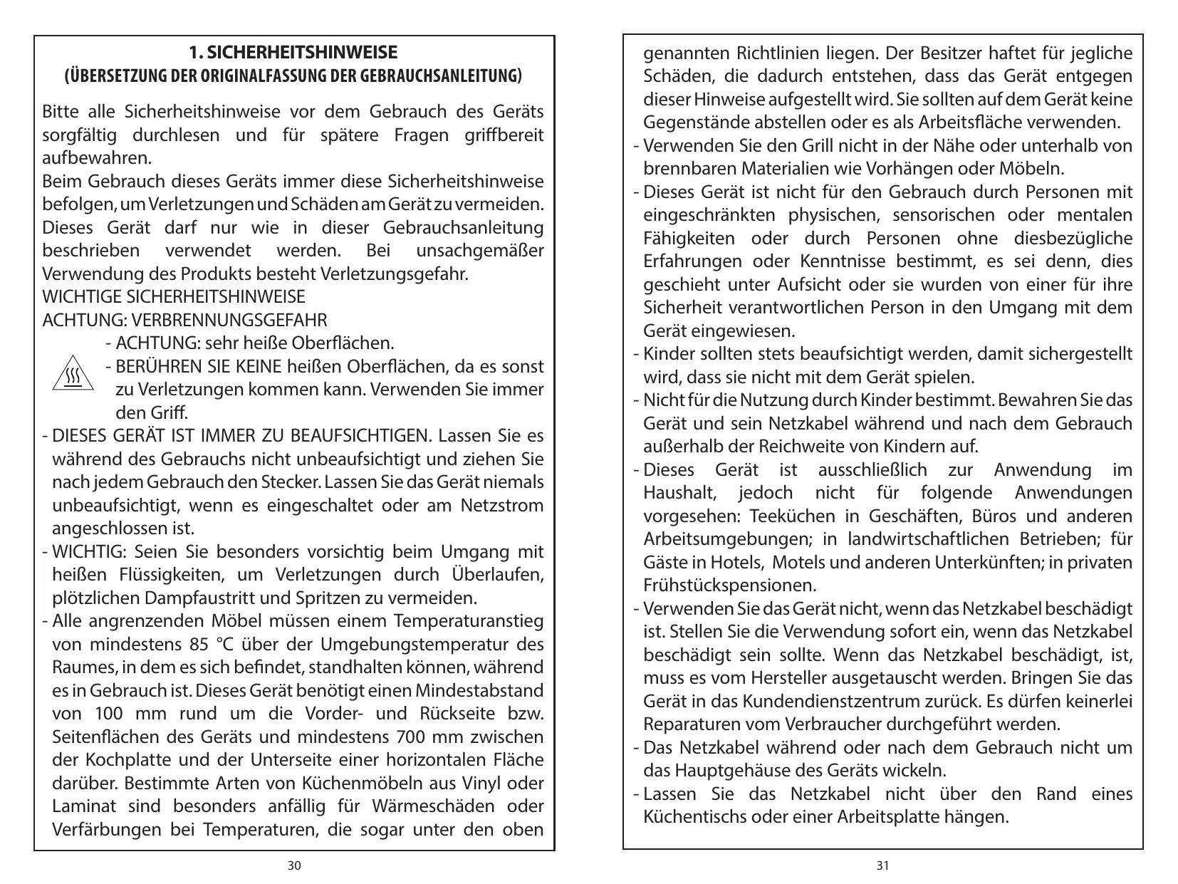 CONSIGNES DE SÉCURITÉ IMPORTANTES - ATTENTION : RISQUE DE BRÛLURE -AVERTISSEMENT : surfaces très chaudes. -NE TOUCHEZ PAS les surfaces chaudes, car vous risqueriez de vous blesser. Utilisez toujours la poignée. - IL S’AGIT D’UN APPAREIL À UTILISER SOUS SURVEILLANCE. Ne le laissez pas sans surveillance pendant l’utilisation, débranchezle après chaque utilisation. Ne laissez jamais l’appareil sans surveillance lorsqu’il est sous tension ou branché. - IMPORTANT : Faites très attention lorsque vous travaillez avec des liquides chauds afin d’éviter les blessures causées par le débordement, la vapeur et les éclaboussures. - Tout meuble adjacent doit pouvoir résister, pendant l’utilisation, à une élévation de température de 85 °C minimum au-dessus de la température ambiante de la pièce dans laquelle il se trouve. Cet appareil nécessite un dégagement frontal, arrière et latéral de 100 mm et un minimum de 700 mm entre la plaque de cuisson et la face inférieure de toute surface horizontale au-dessus de celleci. Certains types de meubles de cuisine en vinyle ou en stratifié sont particulièrement susceptibles d’être endommagés par la chaleur ou de se décolorer à des températures même inférieures aux directives données ci-dessus. Tout dommage causé par l’installation de l’appareil contraire à ces instructions relèvera de la responsabilité du propriétaire. Vous ne devez pas utiliser cet 1