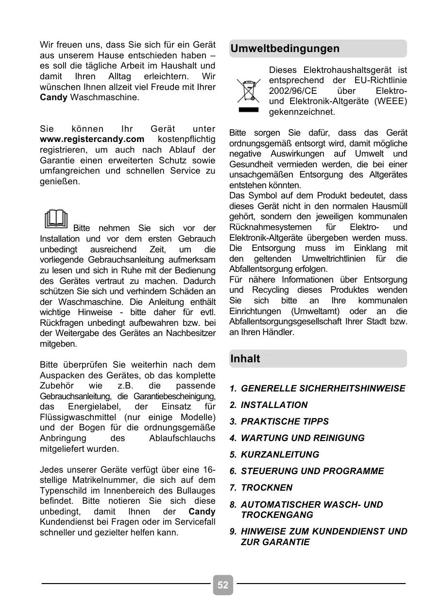 The use of ecological detergents without phosphates may cause the following effects: Wir freuen uns, dass Sie sich für ein Gerät aus unserem Hause entschieden haben – es soll die tägliche Arbeit im Haushalt und damit Ihren Alltag erleichtern. Wir wünschen Ihnen allzeit viel Freude mit Ihrer Candy Waschmaschine. Umweltbedingungen Sie können Ihr Gerät unter www.registercandy.com kostenpflichtig registrieren, um auch nach Ablauf der Garantie einen erweiterten Schutz sowie umfangreichen und schnellen Service zu genießen. Bitte sorgen Sie dafür, dass das Gerät ordnungsgemäß entsorgt wird, damit mögliche negative Auswirkungen auf Umwelt und Gesundheit vermieden werden, die bei einer unsachgemäßen Entsorgung des Altgerätes entstehen könnten. Das Symbol auf dem Produkt bedeutet, dass dieses Gerät nicht in den normalen Hausmüll gehört, sondern den jeweiligen kommunalen Rücknahmesystemen für Elektround Elektronik-Altgeräte übergeben werden muss. Die Entsorgung muss im Einklang mit den geltenden Umweltrichtlinien für die Abfallentsorgung erfolgen. Für nähere Informationen über Entsorgung und Recycling dieses Produktes wenden Sie sich bitte an Ihre kommunalen Einrichtungen (Umweltamt) oder an die Abfallentsorgungsgesellschaft Ihrer Stadt bzw. an Ihren Händler. Dieses Elektrohaushaltsgerät ist entsprechend der EU-Richtlinie 2002/96/CE über Elektround Elektronik-Altgeräte (WEEE) gekennzeichnet. Bitte nehmen Sie sich vor der Installation und vor dem ersten Gebrauch unbedingt ausreichend Zeit, um die vorliegende Gebrauchsanleitung aufmerksam zu lesen und sich in Ruhe mit der Bedienung des Gerätes vertraut zu machen. Dadurch schützen Sie sich und verhindern Schäden an der Waschmaschine. Die Anleitung enthält wichtige Hinweise - bitte daher für evtl. Rückfragen unbedingt aufbewahren bzw. bei der Weitergabe des Gerätes an Nachbesitzer mitgeben. Inhalt Bitte überprüfen Sie weiterhin nach dem Auspacken des Gerätes, ob das komplette Zubehör wie z.B. die passende Gebrauchsanleitung, die Garantiebescheinigung, das Energielabel, der Einsatz für Flüssigwaschmittel (nur einige Modelle) und der Bogen für die ordnungsgemäße Anbringung des Ablaufschlauchs mitgeliefert wurden.