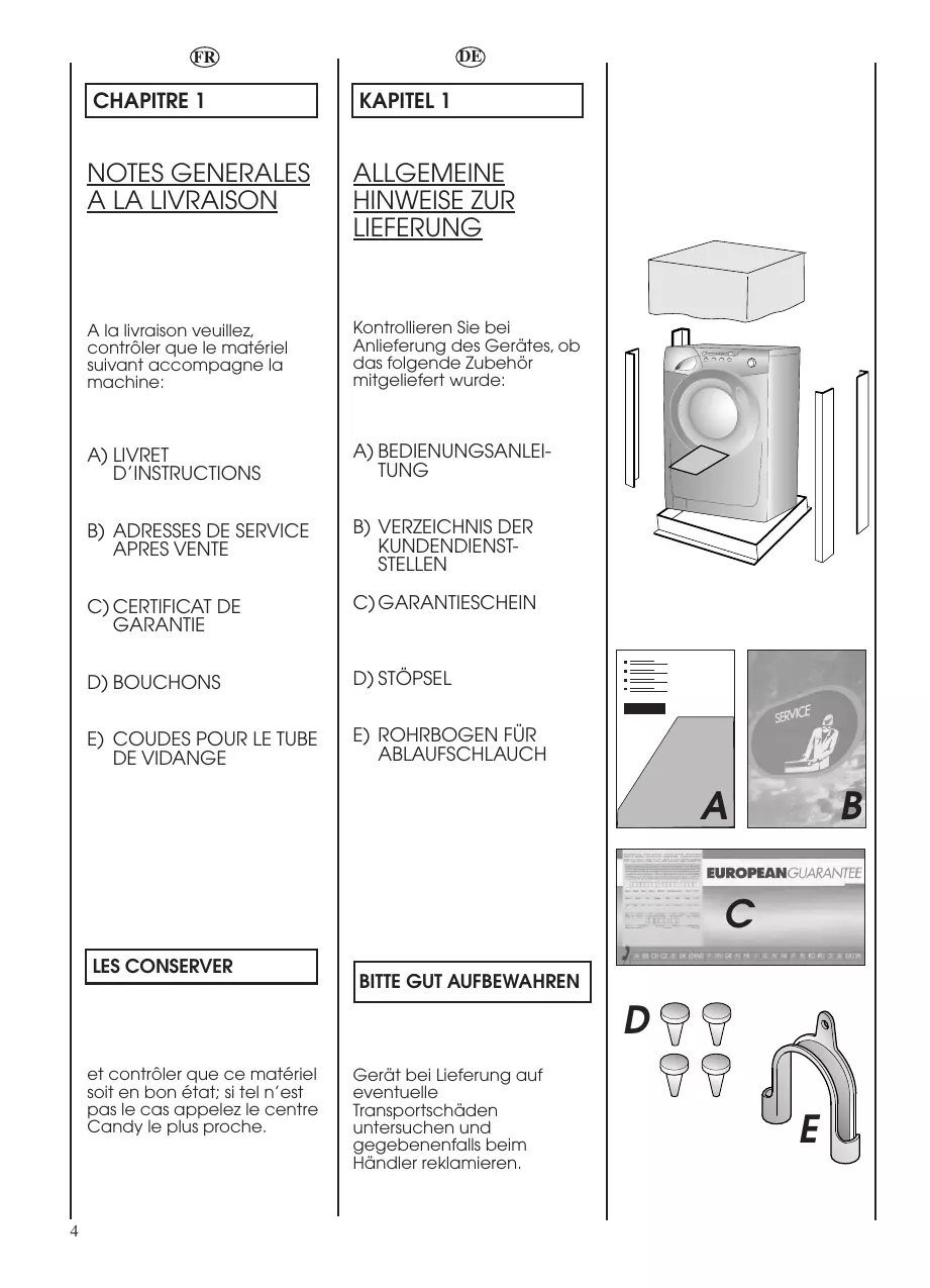 A) LIVRET D’INSTRUCTIONS A) BEDIENUNGSANLEITUNG B) ADRESSES DE SERVICE APRES VENTE B) VERZEICHNIS DER KUNDENDIENSTSTELLEN C) CERTIFICAT DE GARANTIE C) GARANTIESCHEIN D) BOUCHONS D) STÖPSEL E) COUDES POUR LE TUBE DE VIDANGE E) ROHRBOGEN FÜR ABLAUFSCHLAUCH A B C LES CONSERVER BITTE GUT AUFBEWAHREN D et contrôler que ce matériel soit en bon état; si tel n’est pas le cas appelez le centre Candy le plus proche.