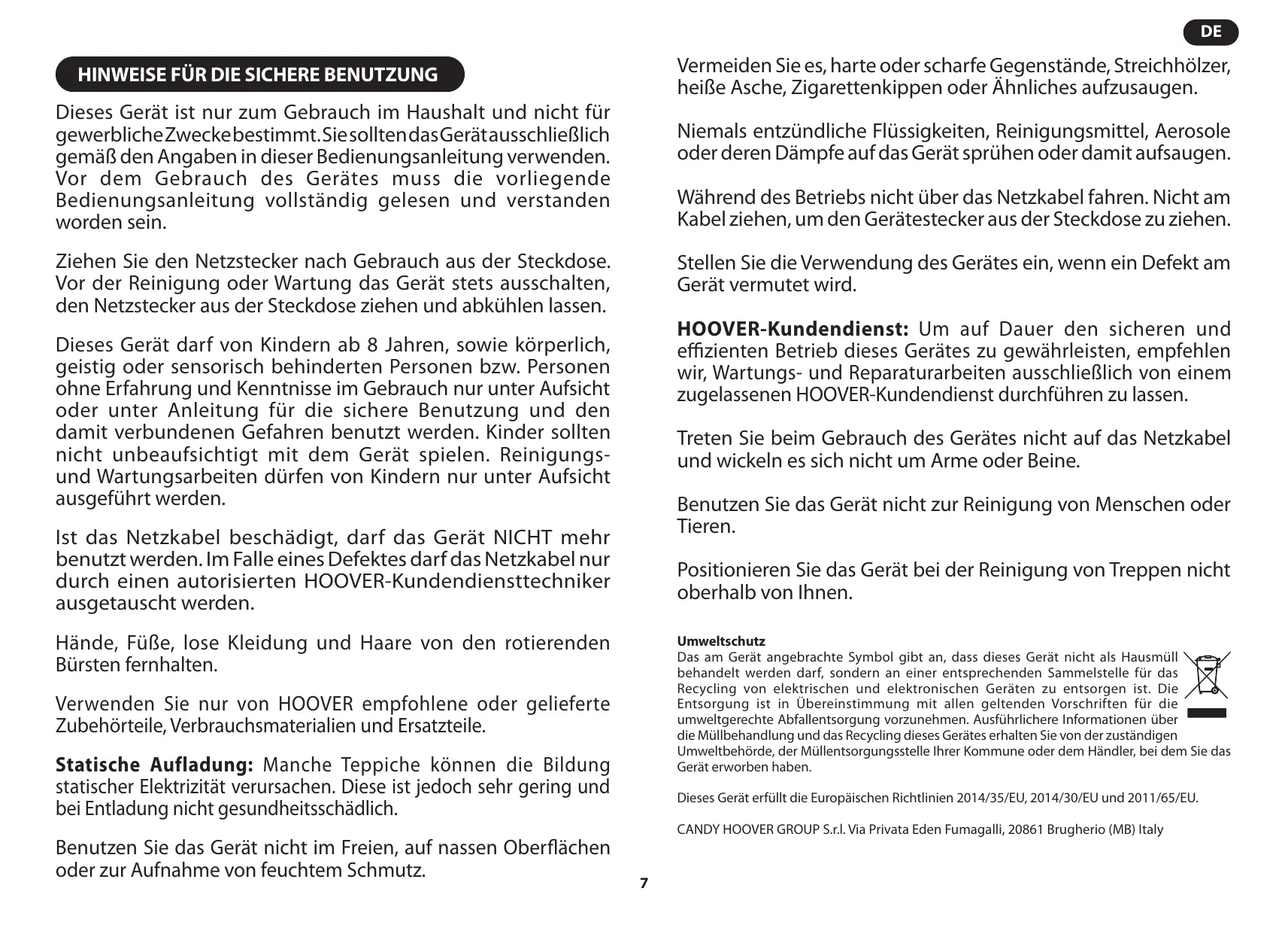 CANDY HOOVER GROUP S.r.l. Via Privata Eden Fumagalli, 20861 Brugherio (MB) Italy