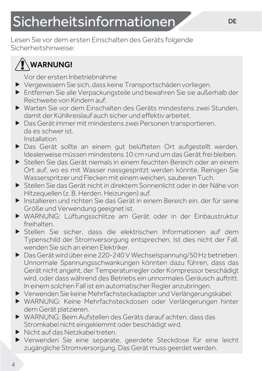 Tenez la fiche, pas le câble, lorsque vous débranchez l’appareil. Ne nettoyez pas l’appareil à l’aide de brosses dures, de brosses métalliques, de détergents en poudre, d’essence, d’acétate d’amyle, d’acétone et de solutions organiques similaires, d’acides ou de solutions alcalines. Nettoyez-le avec un détergent spécial pour réfrigérateur/ congélateur afin d’éviter de l’endommager. Enfin, utilisez de l’eau tiède et une solution de bicarbonate de soude : environ une cuillère à soupe de bicarbonate de soude pour un litre/quart d’eau. Rincez abondamment à l’eau et essuyez. N’utilisez pas de poudres de nettoyage ou d’autres nettoyants abrasifs. Ne lavez pas les pièces amovibles au lave-vaisselle. Ne raclez pas le givre et la glace avec des objets tranchants. N’utilisez pas de pulvérisateurs ni de réchauffeurs électriques comme des nettoyeurs à vapeur, des sèche-cheveux ou d’autres sources de chaleur pour éviter d’endommager les pièces en plastique. AVERTISSEMENT : N’utilisez pas de dispositifs mécaniques ou d’autres moyens pour accélérer le processus de dégivrage, hormis ceux recommandés par le fabricant. Si le cordon d’alimentation est endommagé, faites-le remplacer par le fabricant, le service clientèle ou un électricien qualifié pour éviter tout risque d’accident. N’essayez pas de réparer, démonter ou modifier l’appareil vous-même. En cas de réparation, veuillez contacter notre service clientèle. Si les lampes d’éclairage sont endommagées, elles doivent être remplacées par le fabricant, son service de maintenance ou des personnes de qualification similaire afin d’éviter tout danger. Éliminez la poussière à l’arrière de l’appareil au moins une fois par an pour éviter tout risque d’incendie, ainsi que l’augmentation de la consommation d’énergie. 7