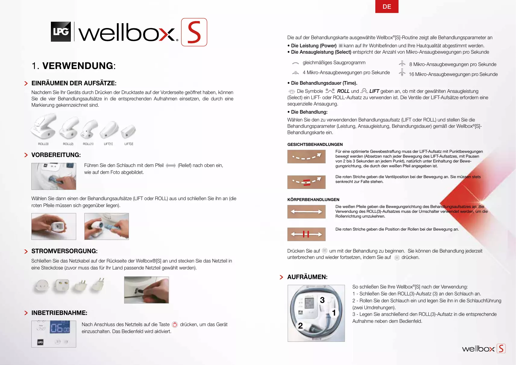ROLL en LIFT geven aan of u met de gekozen aspiratiefrequentie (Select) een LIFT- of ROLL-kop kunt gebruiken. De kleppen van LIFT-koppen moeten sequentieel worden aangeblazen om te kunnen openen en sluiten. • De verzorgingen: Selecteer de verzorgingskop (LIFT of ROLL) en stel dan de gebruiksparameters in (vermogen, aspiratiefrequentie, verzorgingsduur) met behulp van de verzorgingskaart Wellbox®[S].