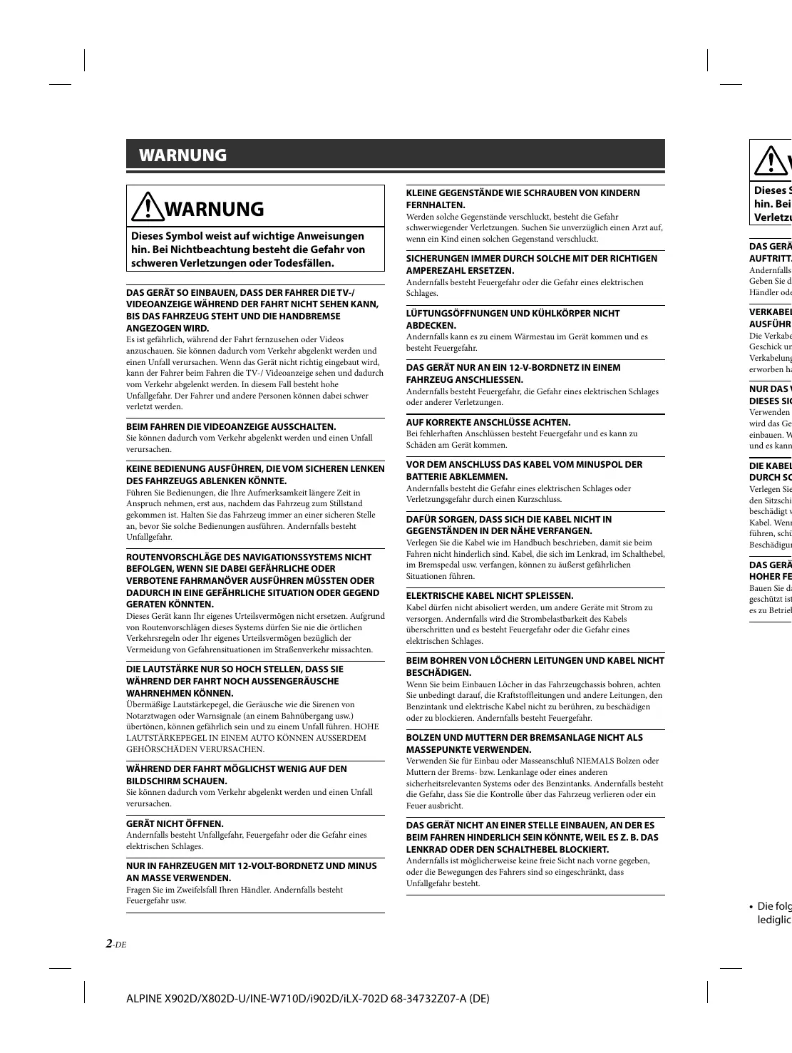 1-DE ALPINE X902D/X802D-U/INE-W710D/i902D/iLX-702D 68-34732Z07-A (DE) WARNUNG WARNUNG Dieses Symbol weist auf wichtige Anweisungen hin. Bei Nichtbeachtung besteht die Gefahr von schweren Verletzungen oder Todesfällen.