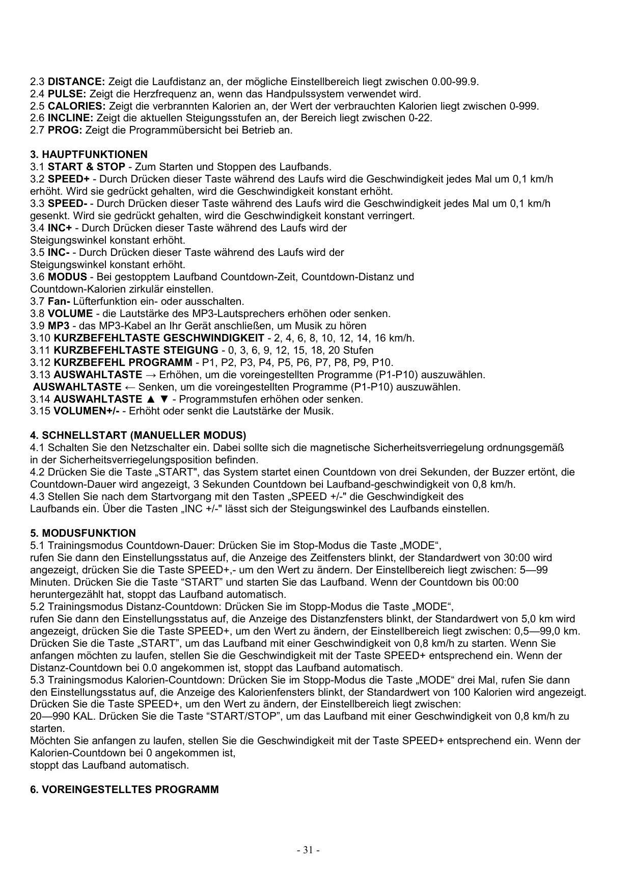 3.15 VOLUME +/- - Augmente ou diminue le volume de la musique. 4. DÉMARRAGE RAPIDE (MODE MANUEL) 4.1 Activez l’interrupteur, la clé de sécurité correctement intégré au tableau sous l’emplacement du verrou de sécurité. 4.2 Appuyez sur Démarrer (Start), le système s’active après trois secondes, un signal sonore retentit, le compte à rebours s’affiche, 3 secondes de compte à rebours une fois que le tapis de course fonctionne à une vitesse de 0,8 km/h. 4.3 Après le démarrage, utilisez les touches Vitesse +/- (SPEED +/-) pour régler la vitesse du tapis de course, les touches Inclinaisons +/- (INC +/-) pour régler l’inclinaison du tapis de course. 5 FONCTIONS DE MODE 5.1 Mode d’exercice avec compte à rebours : à l'arrêt, appuyez sur le bouton MODE, entrez le mode de réglage, la fenêtre d’affichage de temps clignote et affiche par défaut 30:00, appuyez sur le bouton Vitesse +/- (SPEED+/-) pour modifier la valeur de réglage. La plage de réglage est de 5 à 99 minutes. Appuyez sur le bouton Démarrer (START) et démarrez le tapis de course. Lorsque le compte à rebours est à 00:00, le tapis de course s’arrête automatiquement. 5.2 Mode d’exercice avec décompte de la distance : à l’arrêt, appuyez sur le bouton MODE, entrez le mode de réglage, la fenêtre d’affichage de la distance clignote et affiche par défaut 5,0 km, appuyez sur le bouton Vitesse +/- (SPEED+/-) pour modifier la valeur de réglage. La plage de réglage est de : 0,5 à 99,0 km. Appuyez sur Démarrer (START) pour démarrer le tapis de course. Lorsque la vitesse de course atteint 0,8 km/h, appuyez sur Vitesse +/- (SPEED +/-) pour régler la vitesse. Lorsque le décompte de la distance est à 0,0, le tapis de course s’arrête automatiquement. 5.3 Mode d’exercice avec décompte de calories : à l’arrêt, appuyez sur le bouton MODE trois fois pour accéder au mode de réglage. La fenêtre des calories clignote et affiche par défaut 100 CAL. Appuyez sur le bouton Vitesse +/- (SPEED+/-) pour modifier la valeur de réglage. La plage de réglage est de : 20—990 CAL. Appuyez sur Démarrer/Arrêter (START/STOP) pour démarrer le tapis de course. Lorsque la vitesse de course atteint 0,8 km/h appuyez sur le bouton Vitesse +/- (SPEED+/-) pour régler la vitesse. Lorsque le décompte des calories est à 0, le tapis de course s’arrête automatiquement. 6. PROGRAMMES PRÉRÉGLÉS L’appareil comporte 10 programmes intégrés de P1 à P10 (5 niveaux pour chaque programme = 50 programmes) HR1 HR2, en mode veille, appuyez sur la touche Programme (« PROGRAM ») pour afficher la vitesse « P1-P10 HR1 HR2 ». L’affichage Durée (« TIME ») clignote selon le programme ; affiche la durée préréglée à 30:00 ; Vitesse +, Vitesse - (« SPEED + », « SPEED - ») permet de régler la vitesse d’exercice souhaitée. Appuyez sur le bouton Démarrer (« START ») pour démarrer le programme intégré. Le Programme intégré est divisé en 10 segments, chaque durée de segment = valeur de temps indiquée / 10. Lors de la prochaine plage de temps, l’appareil produit le signal sonore « Bi-bi-bi-3 », la vitesse de l’appareil change avec le segment de programme. Pendant ce changement, vous pouvez appuyer sur les boutons Vitesse +, Vitesse - (« SPEED + », « SPEED - ») pour régler la vitesse. Mais lorsque le programme passe au segment suivant, la vitesse reprend quelques temps après le démarrage du programme. L’appareil émet un signal sonore « B i-B i » et entre en mode veille après 5 secondes d’arrêt complet. 1) HR1 (SANTÉ) indique que la plage vise 80 % du rythme cardiaque maximum, contrôle du rythme cardiaque. 2) HR2 (FITNESS) indique que la plage vise 90 % du rythme cardiaque maximum, contrôle du rythme cardiaque. LISTE DES PROGRAMMES RÉGLAGE DU TEMPS/10 = TEMPS DE CHAQUE SESSION 1