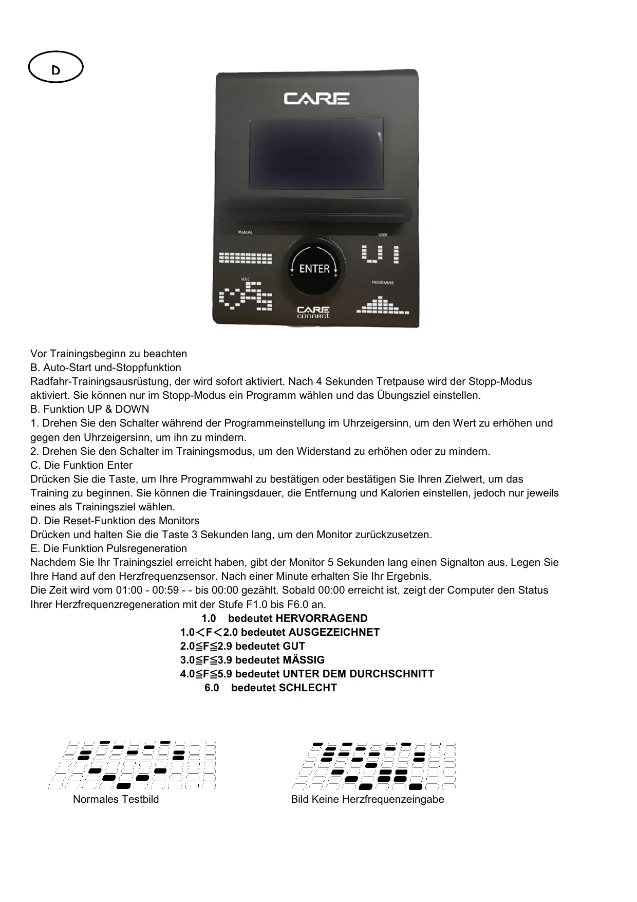 C. Die Funktion Enter Drücken Sie die Taste, um Ihre Programmwahl zu bestätigen oder bestätigen Sie Ihren Zielwert, um das Training zu beginnen. Sie können die Trainingsdauer, die Entfernung und Kalorien einstellen, jedoch nur jeweils eines als Trainingsziel wählen. D. Die Reset-Funktion des Monitors Drücken und halten Sie die Taste 3 Sekunden lang, um den Monitor zurückzusetzen. E. Die Funktion Pulsregeneration Nachdem Sie Ihr Trainingsziel erreicht haben, gibt der Monitor 5 Sekunden lang einen Signalton aus. Legen Sie Ihre Hand auf den Herzfrequenzsensor. Nach einer Minute erhalten Sie Ihr Ergebnis. Die Zeit wird vom 01:00 - 00:59 - - bis 00:00 gezählt. Sobald 00:00 erreicht ist, zeigt der Computer den Status Ihrer Herzfrequenzregeneration mit der Stufe F1.0 bis F6.0 an.