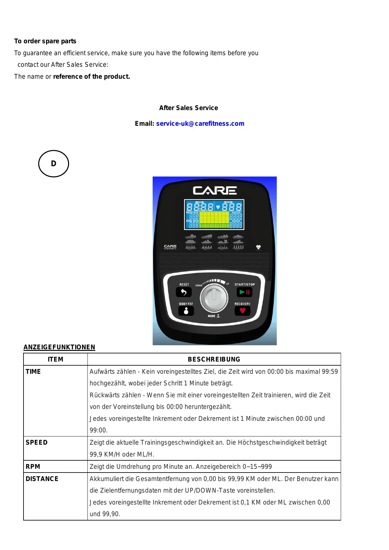 Service Après Vente (Kundendienst) E mail : service-de@carefitness.com