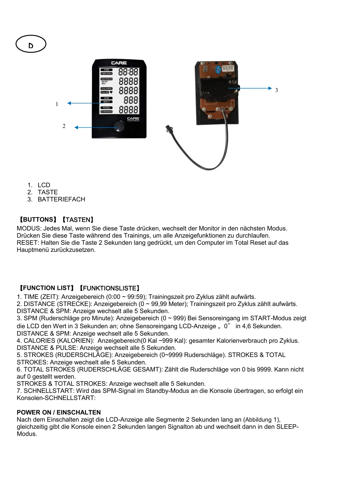 【FUNCTION LIST】【FUNKTIONSLISTE】 1. TIME (ZEIT): Anzeigebereich (0:00 ~ 99:59); Trainingszeit pro Zyklus zählt aufwärts. 2. DISTANCE (STRECKE): Anzeigebereich (0 ~ 99,99 Meter); Trainingszeit pro Zyklus zählt aufwärts. DISTANCE & SPM: Anzeige wechselt alle 5 Sekunden. 3. SPM (Ruderschläge pro Minute): Anzeigebereich (0 ~ 999) Bei Sensoreingang im START-Modus zeigt die LCD den Wert in 3 Sekunden an; ohne Sensoreingang LCD-Anzeige „ 0” in 4,6 Sekunden. DISTANCE & SPM: Anzeige wechselt alle 5 Sekunden. 4. CALORIES (KALORIEN): Anzeigebereich(0 Kal ~999 Kal): gesamter Kalorienverbrauch pro Zyklus. DISTANCE & PULSE: Anzeige wechselt alle 5 Sekunden. 5. STROKES (RUDERSCHLÄGE): Anzeigebereich (0~9999 Ruderschläge). STROKES & TOTAL STROKES: Anzeige wechselt alle 5 Sekunden. 6. TOTAL STROKES (RUDERSCHLÄGE GESAMT): Zählt die Ruderschläge von 0 bis 9999. Kann nicht auf 0 gestellt werden. STROKES & TOTAL STROKES: Anzeige wechselt alle 5 Sekunden. 7. SCHNELLSTART: Wird das SPM-Signal im Standby-Modus an die Konsole übertragen, so erfolgt ein Konsolen-SCHNELLSTART: POWER ON / EINSCHALTEN Nach dem Einschalten zeigt die LCD-Anzeige alle Segmente 2 Sekunden lang an (Abbildung 1), gleichzeitig gibt die Konsole einen 2 Sekunden langen Signalton ab und wechselt dann in den SLEEPModus.