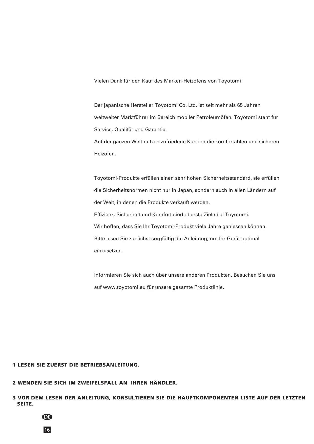 Un combustible approprié est donc essentiel pour un usage sûr et durable de votre appareil. La garantie ne couvre pas les dommages et/ou pannes de l´appareil mobile de chauffage causés par l’utilisation d’un combustible autre que celui qui est recommandé. Pour connaître le combustible le mieux adapté, consultez votre revendeur (www. toyotomi.eu).