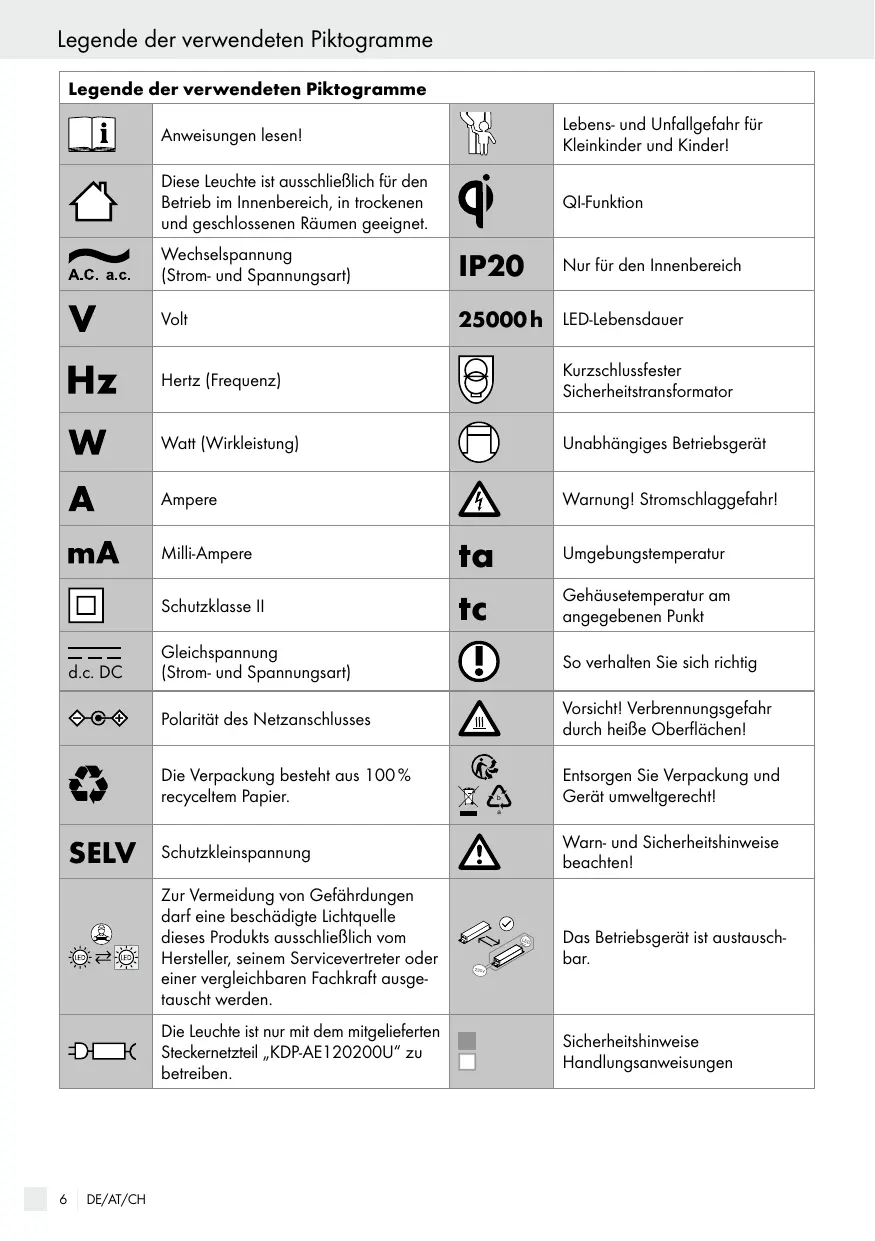 DANGER DE MORT ET RISQUE D‘ACCIDENT POUR LES ENFANTS EN BAS ÂGE ET LES ENFANTS ! Ne laissez jamais les enfants jouer sans surveillance avec l’emballage. Ils peuvent s‘étouffer avec les matériaux de l‘emballage. Les enfants sous-estiment souvent le danger. Cet appareil peut être utilisé par des enfants de 8 ans et plus ainsi que par des personnes avec des capacités physiques, psychiques ou sensorielles limitées ou manquant d‘expérience ou de connaissance, s‘ils sont surveillés ou s‘ils ont été informés de l‘utilisation de l‘appareil de manière sûre et comprennent les risques découlant de son utilisation. Ne laissez pas les enfants jouer avec le produit. Le nettoyage et la maintenance domestique de l’appareil ne doivent pas être effectués par un enfant sans surveillance. RISQUE DE BLESSURES ! Ne laissez pas la lampe ou le matériel d‘emballage traîner sans surveillance. Les films et les sachets en plastique, les éléments en matières synthétiques, etc. peuvent constituer des jouets dangereux pour les enfants.