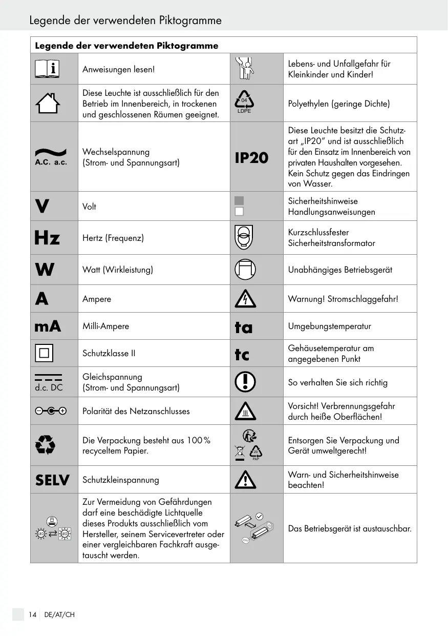 DANGER DE MORT ET RISQUE D‘ACCIDENT POUR LES ENFANTS EN BAS ÂGE ET LES ENFANTS ! Ne laissez jamais les enfants jouer sans surveillance avec l’emballage. Ils peuvent s‘étouffer avec les matériaux de l‘emballage. Les enfants sous-estiment souvent le danger. Cet appareil peut être utilisé par des enfants de 8 ans et plus ainsi que par des personnes avec des capacités physiques, psychiques ou sensorielles limitées ou manquant d‘expérience ou de connaissance, s‘ils sont surveillés ou s‘ils ont été informés de l‘utilisation de l‘appareil de manière sûre et comprennent les risques découlant de son utilisation. Ne laissez pas les enfants jouer avec le produit. Le nettoyage et la maintenance domestique de l’appareil ne doivent pas être effectués par un enfant sans surveillance. RISQUE DE BLESSURES ! Ne laissez pas la lampe ou le matériel d‘emballage traîner sans surveillance. Les films et les sachets en plastique, les éléments en matières synthétiques, etc. peuvent constituer des jouets dangereux pour les enfants.