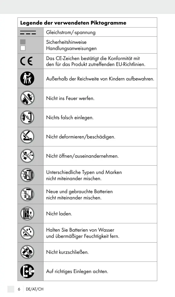 La marque CE indique la conformité aux directives européennes applicables à ce produit. À conserver hors de la portée des enfants Ne pas jeter au feu Veiller à une insertion correcte Ne pas déformer/détériorer Ne pas ouvrir/démonter Ne pas mélanger des types et des marques différents Ne pas mélanger des piles usées et des piles neuves Ne pas recharger Tenez les piles éloignées de l’eau et d’une humidité excessive. Ne pas court-circuiter Insérer correctement 28