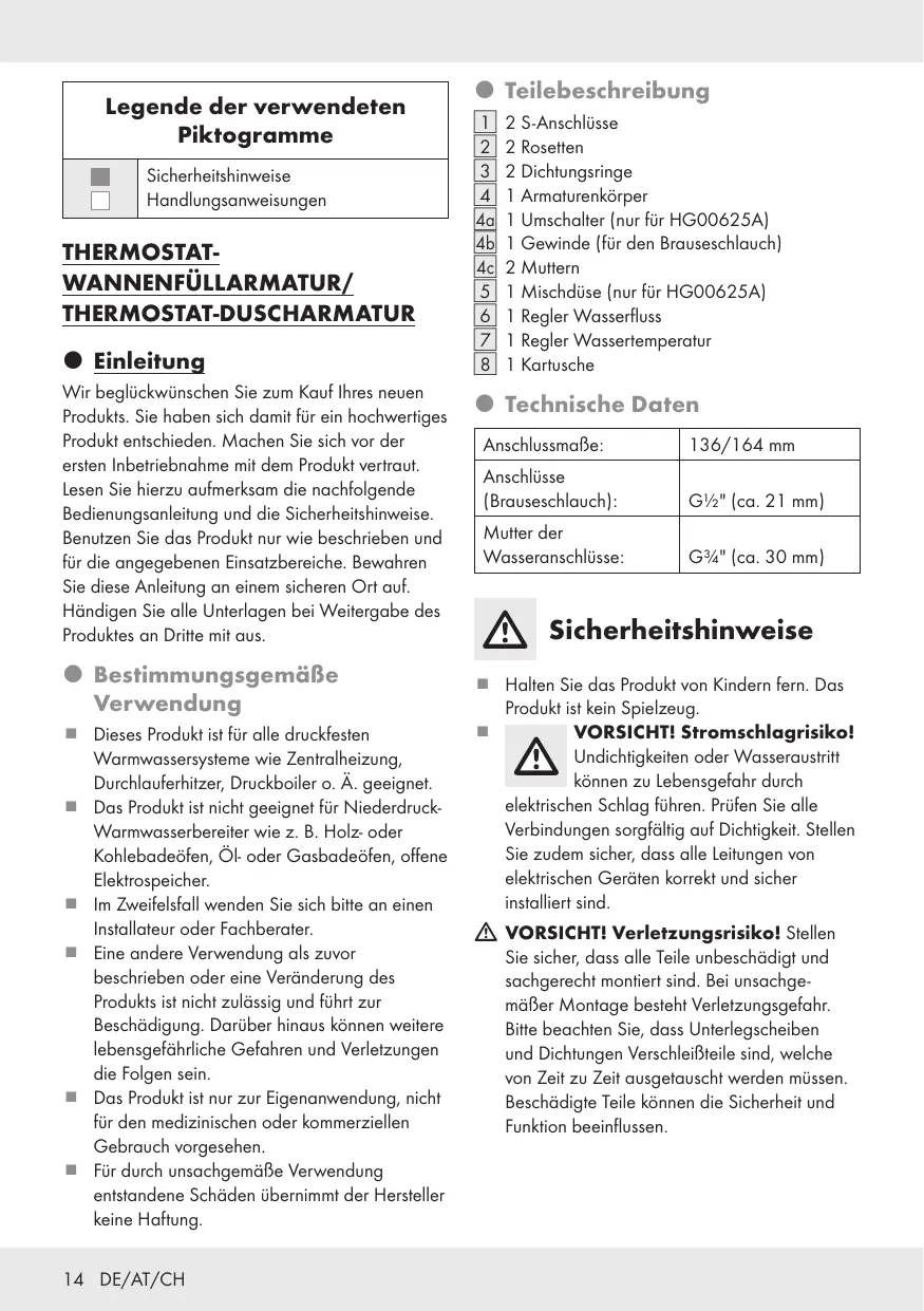 Gebruik geen bijtende of alcoholhoudende middelen om mee schoon te maken omdat deze het product kunnen beschadigen. Reinig de armaturen alleen met schoon water, een mild reinigingsmiddel en een zachte doek c.q. zeemleer. Schroef de mengkraan [5] regelmatig los en verwijder kalkachtige voorwerpen uit de leiding. Kalkvorming voorkomen: Schroef de patroon [8] los en reinig deze elke 3 maanden. Afvoer De verpakking bestaat uit milieuvriendelijke grondstoffen die u via de plaatselijke recyclingcontainers kunt afvoeren. Informatie over de mogelijkheden om het uitgediende product na gebruik te verwijderen, verstrekt uw gemeentelijke overheid. Het product, waaronder het toebehoren, en de verpakkingsmaterialen kunnen worden gerecycled en zijn onderhevig aan een uitgebreide verantwoordelijkheid van de fabrikant. Gooi ze apart weg, overeenkomstig de aangegeven Info-tri (informatie over afvalscheiding), voor een beter afvalbeheer. Het Triman-logo geldt alleen voor Frankrijk. Garantie Het product werd volgens strenge kwaliteitsrichtlijnen gemaakt en voor de uitlevering zorgvuldig gecontroleerd. In geval van materiaalof fabricagefouten hebt u tegenover de verkoper van het product wettelijke rechten. Uw wettelijke rechten worden op geen enkele manier door onze hieronder vermelde garantie beperkt. Het artikelnummer vindt u op de typeplaat, ingegraveerd, op het titelblad van uw handleiding (linksonder) of als sticker op de achter- of onderzijde. Wanneer er storingen in de werking of andere gebreken optreden, dient u eerst telefonisch of per e-mail contact met de onderstaande service-afdeling op te nemen. De garantie voor dit product bedraagt 5 jaar vanaf aankoopdatum. De garantieperiode gaat in op de datum van aankoop. Bewaar het originele bewijs van aankoop op een veilige plek aangezien dit document nodig is als bewijs. Een als defect geregistreerd product kunt u dan samen met uw aankoopbewijs (kassabon) en vermelding van de concrete schade alsmede het tijdstip van optreden voor u franco aan het u meegedeelde servicepunt verzenden. Alle beschadigingen of gebreken die reeds op het moment van aankoop aanwezig zijn, moeten meteen na het uitpakken van het product worden gemeld. Service Mocht het product binnen 5 jaar na aankoopdatum een materiaal- of fabricagefout vertonen, zullen wij het – naar onze keuze – gratis voor u repareren of vervangen. De garantieperiode wordt door een plaatsgevonden garantieverlening niet verlengd. Dit geldt ook voor vervangen en gerepareerde onderdelen. ervice Nederland Tel.: 08000225537 E-Mail: owim@lidl.nl Service Belgiё Tel.: 080071011 Tel.: 80023970 (Luxemburg) E-Mail: owim@lidl.be HG00625A HG00625B Deze garantie vervalt als het product werd beschadigd of onjuist is gebruikt of onderhouden. De garantie dekt materiaal- en fabricagefouten af. Deze garantie dekt geen productonderdelen die aan normale slijtage onderhevig zijn en daarom als verbruiksartikelen worden beschouwd (bv. batterijen, oplaadbare batterijen, slangen, inktpatronen), noch dekt zij schade aan breekbare onderdelen, bv. schakelaars of onderdelen die van glas zijn gemaakt. Afwikkeling in geval van garantie Om een snelle afhandeling van uw reclamatie te waarborgen dient u de volgende instructies in acht te nemen: Houd bij alle vragen alstublieft de kassabon en het artikelnummer (IAN 472151_2401) als bewijs van aankoop bij de hand. NL/BE 13 Legende der verwendeten Piktogramme Sicherheitshinweise Handlungsanweisungen THERMOSTATWANNENFÜLLARMATUR/ THERMOSTAT-DUSCHARMATUR Einleitung Wir beglückwünschen Sie zum Kauf Ihres neuen Produkts. Sie haben sich damit für ein hochwertiges Produkt entschieden. Machen Sie sich vor der ersten Inbetriebnahme mit dem Produkt vertraut. Lesen Sie hierzu aufmerksam die nachfolgende Bedienungsanleitung und die Sicherheitshinweise. Benutzen Sie das Produkt nur wie beschrieben und für die angegebenen Einsatzbereiche. Bewahren Sie diese Anleitung an einem sicheren Ort auf. Händigen Sie alle Unterlagen bei Weitergabe des Produktes an Dritte mit aus. Bestimmungsgemäße Verwendung Dieses Produkt ist für alle druckfesten Warmwassersysteme wie Zentralheizung, Durchlauferhitzer, Druckboiler o. Ä. geeignet. Das Produkt ist nicht geeignet für NiederdruckWarmwasserbereiter wie z. B. Holz- oder Kohlebadeöfen, Öl- oder Gasbadeöfen, offene Elektrospeicher. Im Zweifelsfall wenden Sie sich bitte an einen Installateur oder Fachberater. Eine andere Verwendung als zuvor beschrieben oder eine Veränderung des Produkts ist nicht zulässig und führt zur Beschädigung. Darüber hinaus können weitere lebensgefährliche Gefahren und Verletzungen die Folgen sein. Das Produkt ist nur zur Eigenanwendung, nicht für den medizinischen oder kommerziellen Gebrauch vorgesehen. Für durch unsachgemäße Verwendung entstandene Schäden übernimmt der Hersteller keine Haftung. 14 DE/AT/CH Teilebeschreibung [1] [2] [3] [4] [4a] [4b] [4c] [5] [6] [7] [8] 2 S-Anschlüsse 2 Rosetten 2 Dichtungsringe 1 Armaturenkörper 1 Umschalter (nur für HG00625A) 1 Gewinde (für den Brauseschlauch) 2 Muttern 1 Mischdüse (nur für HG00625A) 1 Regler Wasserfluss 1 Regler Wassertemperatur 1 Kartusche Technische Daten Anschlussmaße: 136/164 mm Anschlüsse (Brauseschlauch): G½" (ca. 21 mm) Mutter der Wasseranschlüsse: G¾" (ca. 30 mm) Sicherheitshinweise Halten Sie das Produkt von Kindern fern. Das Produkt ist kein Spielzeug. VORSICHT! Stromschlagrisiko! Undichtigkeiten oder Wasseraustritt können zu Lebensgefahr durch elektrischen Schlag führen. Prüfen Sie alle Verbindungen sorgfältig auf Dichtigkeit. Stellen Sie zudem sicher, dass alle Leitungen von elektrischen Geräten korrekt und sicher installiert sind. m VORSICHT! Verletzungsrisiko! Stellen Sie sicher, dass alle Teile unbeschädigt und sachgerecht montiert sind. Bei unsachge mäßer Montage besteht Verletzungsgefahr. Bitte beachten Sie, dass Unterlegscheiben und Dichtungen Verschleißteile sind, welche von Zeit zu Zeit ausgetauscht werden müssen. Beschädigte T