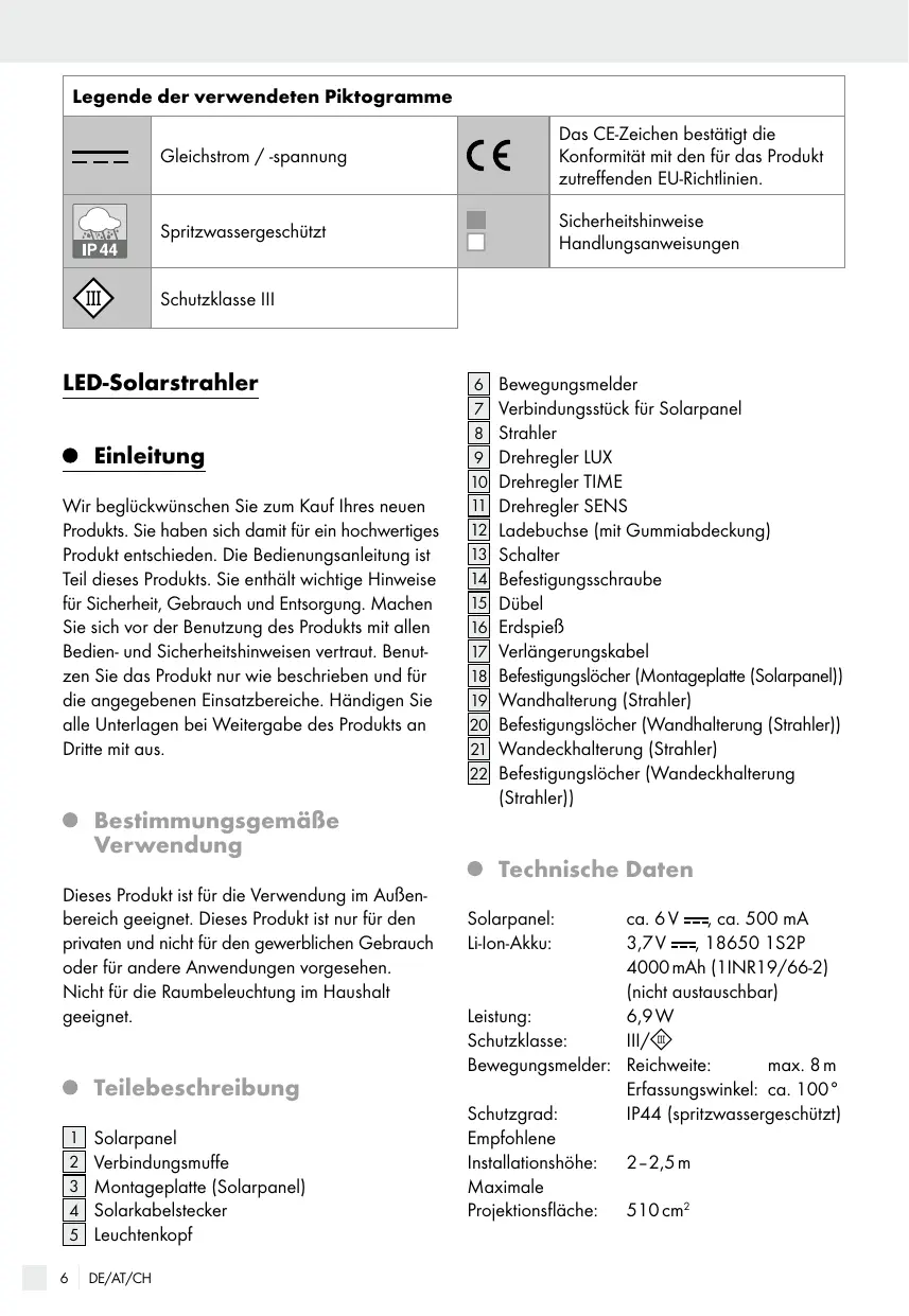 Technische Daten Solarpanel: ca. 6 V , ca. 500 mA Li-Ion-Akku: 3,7 V , 18650 1S2P 4000 mAh (1INR19/66-2) (nicht austauschbar) Leistung: 6,9 W Schutzklasse: III/ Bewegungsmelder: Reichweite: max. 8 m