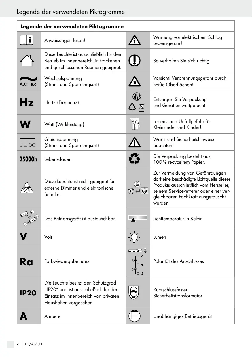 Die Leuchte besitzt den Schutzgrad „IP20“ und ist ausschließlich für den Einsatz im Innenbereich von privaten Haushalten vorgesehen.