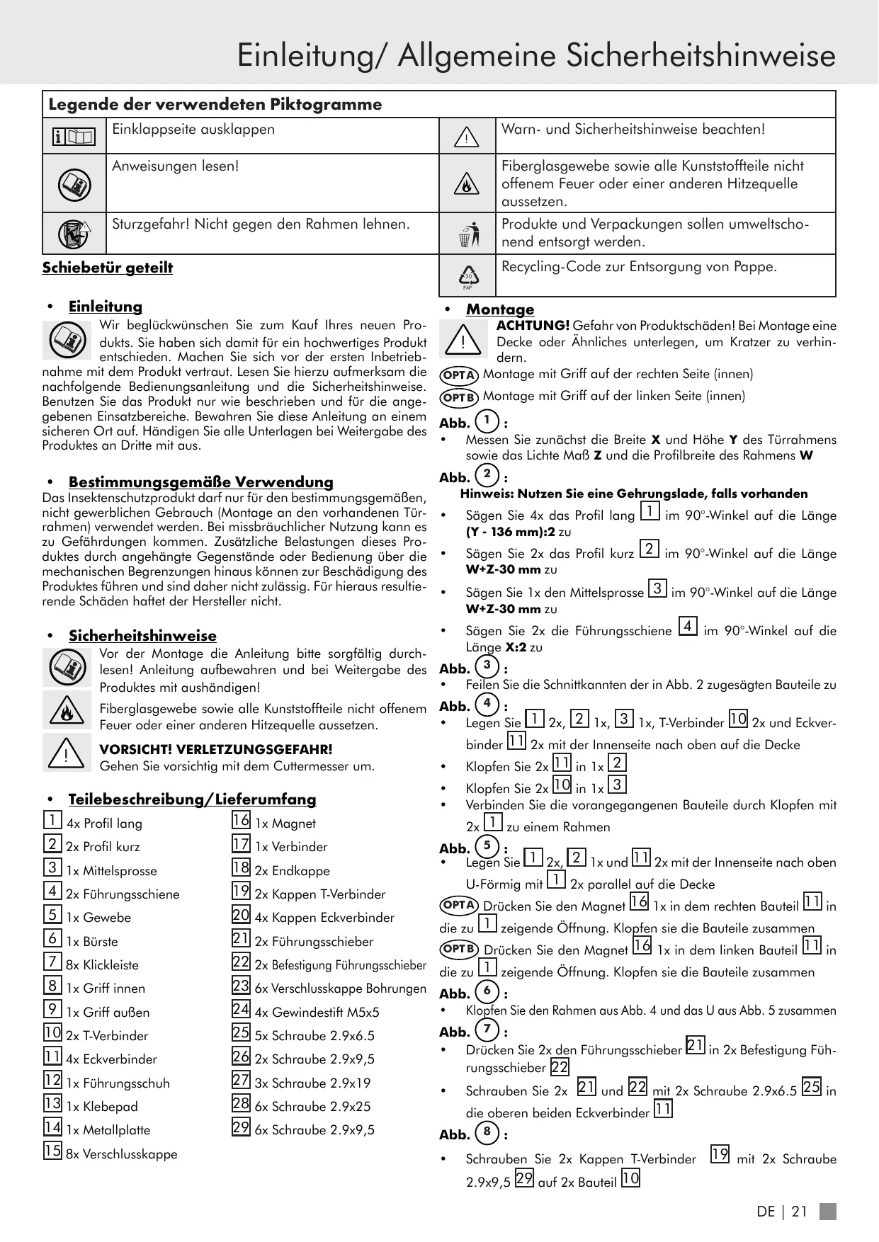 BLESSURES ! Manipulez le cutter avec travers.. Vissez fermement le sabot de guidage avec 3x vis 27 Fig. 12 : Fig. 28 : • Introduisez 1x brosse 6 dans l’élargissement de chaque ca- • Collez 1x plaquette adhésive 13 sur le côté de la plaque métallique 14 avec les trous non débouchants puchon de connecteur d’angle 20 autour du cadre par les canaux extérieurs, coupez la brosse qui dépasse des angles OPT A Fixez la plaque métallique contre l’aimant 16 sur le côté in• Pliez légèrement l’extrémité de la brosse et poussez-la à tra- térieur inférieur droit de la porte coulissante. Retirer le film de la plavers le canal élargi dans le capuchon d’extrémité jusqu’au coin quette adhésive OPT B Fixez la plaque métallique contre l’aimant 16 sur le côté inFig. 13 : 15 • Pressez 8x capuchon de fermeture dans les ouvertures des térieur inférieur gauche de la porte coulissante. Retirer le film de la plaquette adhésive composants situées sur les bords 10 et 11