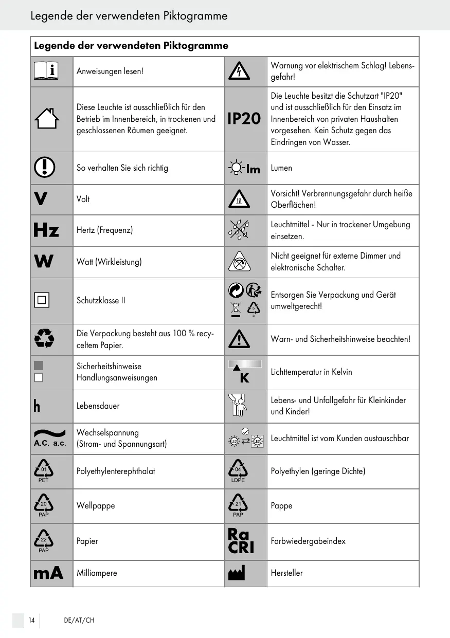 9 Ce luminaire possède l’indice de protec tion « IP20 » et est exclusivement prévu pour une utilisation à l’intérieur des habita tions privées. Il n’est pas protégé contre la pénétration de l’eau.