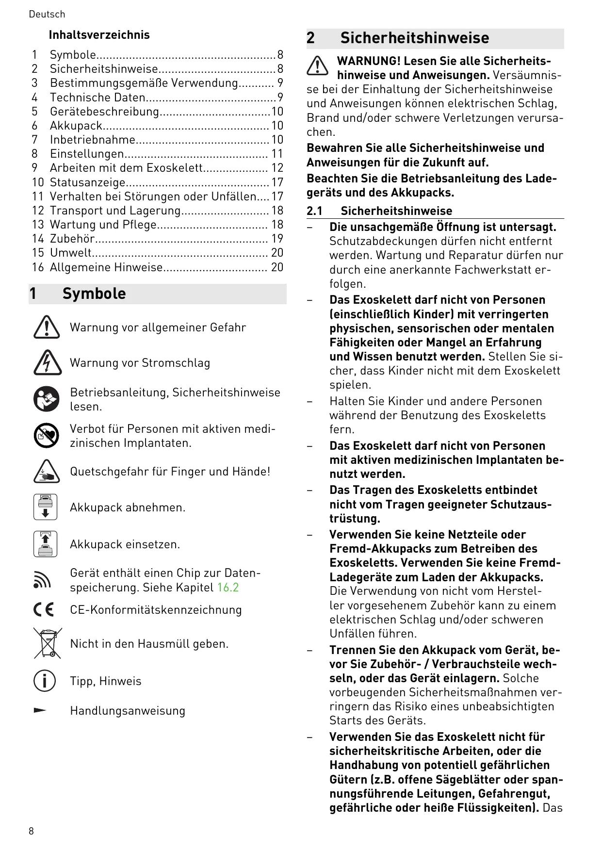 – Está prohibido abrir la herramienta de manera indebida. No está permitido reti rar las cubiertas de protección. El manteni miento y la reparación solo deben llevarse a cabo en un taller especializado autoriza do. – El exoesqueleto no debe ser utilizado por personas (incluidos los niños) que por razones físicas, sensoriales o psíquicas, inexperiencia o desconocimiento no estén capacitadas para su uso. Evite que los ni ños jueguen con el exoesqueleto. Peligro de aplastamiento de dedos y manos Extraer la batería. Insertar la batería. La herramienta cuenta con un chip pa ra el almacenamiento de datos. Ver apartado 16.2 Marcado CE de conformidad No depositar en la basura doméstica. Consejo, indicación Guía de procedimiento