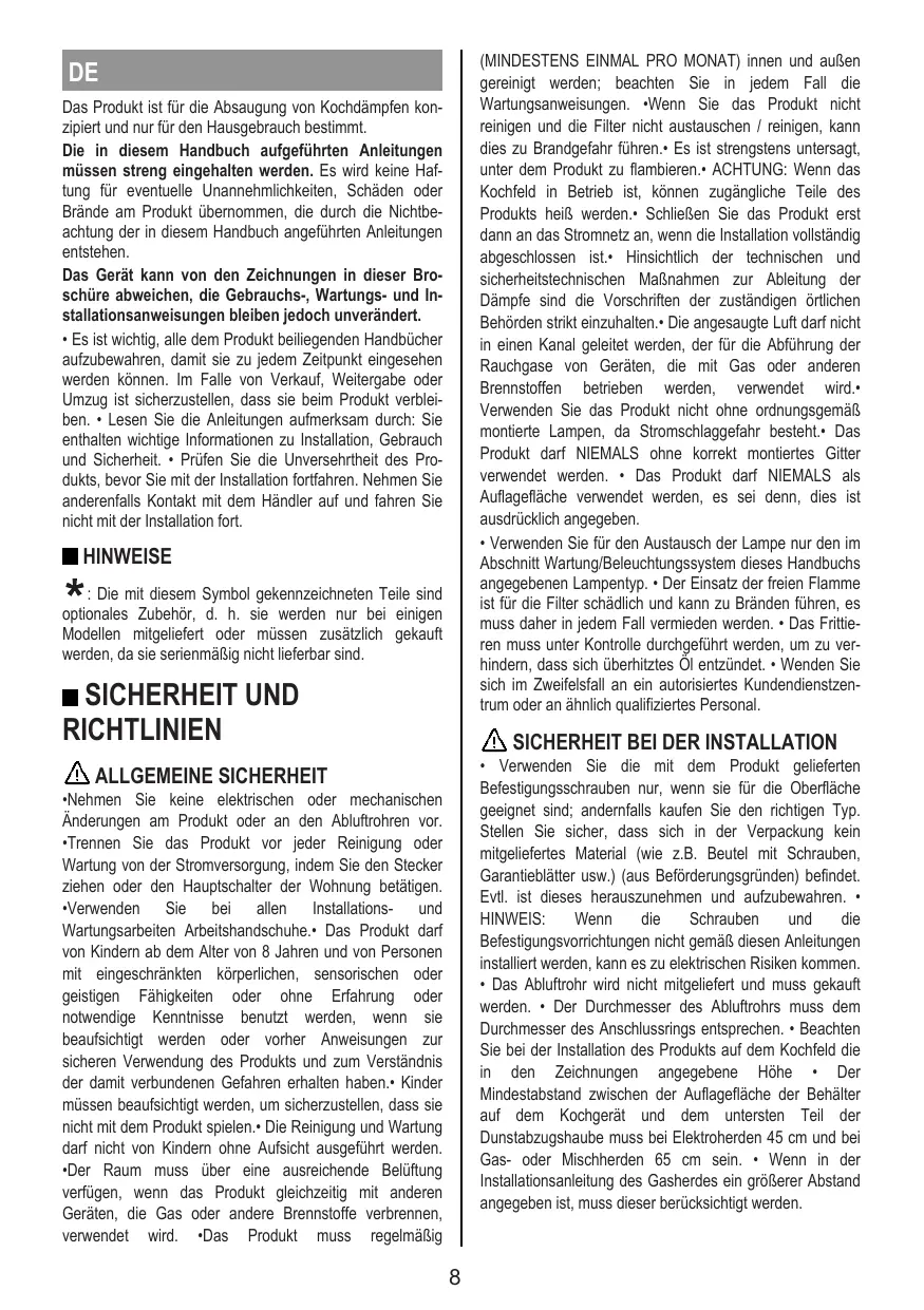FR Le produit est conçu pour l’aspiration des fumées et des vapeurs de cuisson et est destiné au seul usage domestique.