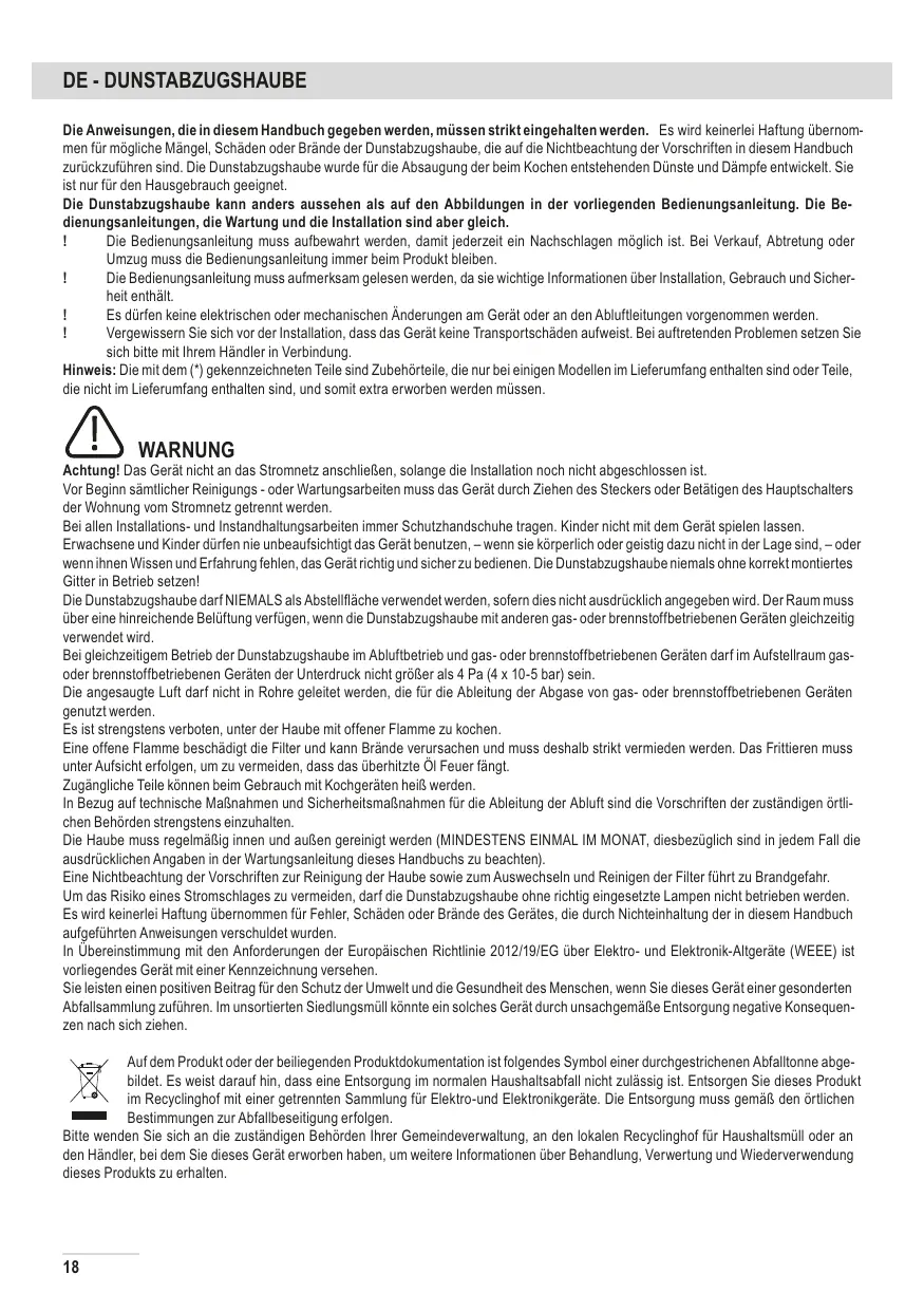 Avant toute opération de nettoyage ou d’entretien, débrancher la hotte du circuit électrique en retirant la prise ou en coupant l’interrupteur général de l’habitation. Munissez-vous de gants de travail avant d’effectuer toute opération d’installation et d’entretien. L’appareil n’est pas destiné à une utilisation par des enfants ou des personnes à capacités physiques, sensorielles ou mentales réduites et sans expérience et connaissance à moins qu’ils ne soient sous la supervision ou formés sur l’utilisation de l’appareil par une personne responsable de leur sécurité. Les enfants doivent être surveillés afin qu’ils ne jouent pas avec l’appareil. Ne jamais utiliser la hotte sans que la grille ne soit montée correctement! La hotte ne doit JAMAIS être utilisée comme plan pour déposer quelque chose sauf si cela est expressément indiqué. Quand la hotte est utilisée en même temps que d’autres appareils à combustion de gaz ou d’autres combustibles, le local doit disposer d’une ventilation suffisante. L’air aspiré ne doit jamais être envoyé dans un conduit utilisé pour l’évacuation des fumées produites par des appareils à combustion de gaz ou d’autres combustibles. Il est formellement interdit de faire flamber les aliments sous la hotte. L’utilisation de flammes libres peut entraîner des dégâts aux filtres et peut donner lieu à des incendies, il faut donc les éviter à tout prix. La friture d’aliments doit être réalisée sous contrôle pour éviter que l’huile surchauffée ne prenne feu. Les pièces accessibles peuvent se réchauffer de façon importante quand elles sont utilisées avec des appareils pour la cuisson. En ce qui concerne les mesures techniques et de sécurité à adopter pour l’évacuation des fumées, s’en tenir strictement à ce qui est prévu dans les règlements des autorités locales compétentes. La hotte doit être régulièrement nettoyée, aussi bien à l’intérieur qu’à l’extérieur (AU MOINS UNE FOIS PAR MOIS, respecter néanmoins les instructions relatives à l’entretien fournies dans ce manuel). La non observation de ces normes de nettoyage de la hotte et du changement et nettoyage des filtres comporte des risques d’incendie. Ne pas utiliser ou laisser la hotte sans que les ampoules soient correctement placées pour éviter tout risque de choc électrique. La société décline toute responsabilité pour d’éventuels inconvénients, dégâts ou incendies provoqués par l’appareil et dérivés de la non observation des instructions reprises dans ce manuel. Cet appareil porte le symbole du recyclage conformément à la Directive Européenne 2012/19/CE concernant les Déchets d’Équipements Électriques et Électroniques (DEEE ou WEEE). En procédant correctement à la mise au rebut de cet appareil, vous contribuerez à empêcher toute conséquence nuisible pour l’environnement et la santé de l’homme. Le symbole présent sur l’appareil ou sur la documentation qui l’accompagne indique que ce produit ne peut en aucun cas être traité comme déchet ménager. Il doit par conséquent être remis à un centre de collecte des déchets chargé du recyclage des équipements électriques et électroniques. Pour la mise au rebut, respectez les normes relatives à l’élimination des déchets en vigueur dans le pays d’installation. Pour obtenir de plus amples détails au sujet du traitement, de la récupération et du recyclage de cet appareil, veuillez vous adresser au bureau compétent de votre commune, à la société de collecte des déchets ou directement à votre revendeur.