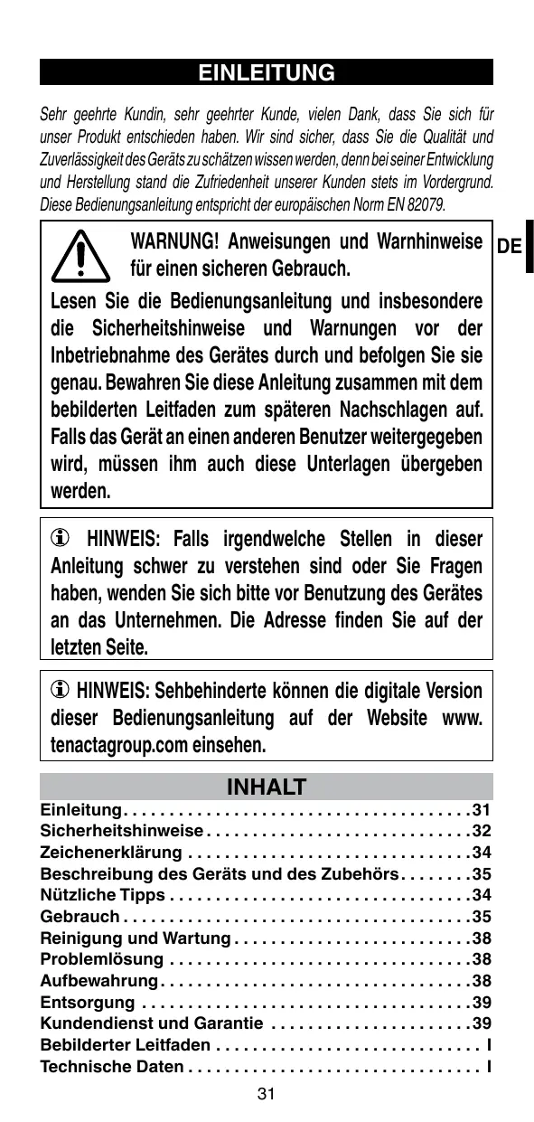 @ HINWEIS: Sehbehinderte kônnen die digitale Version dieser Bedienungsanleitung auf der Website www. tenactagroup.com einsehen.