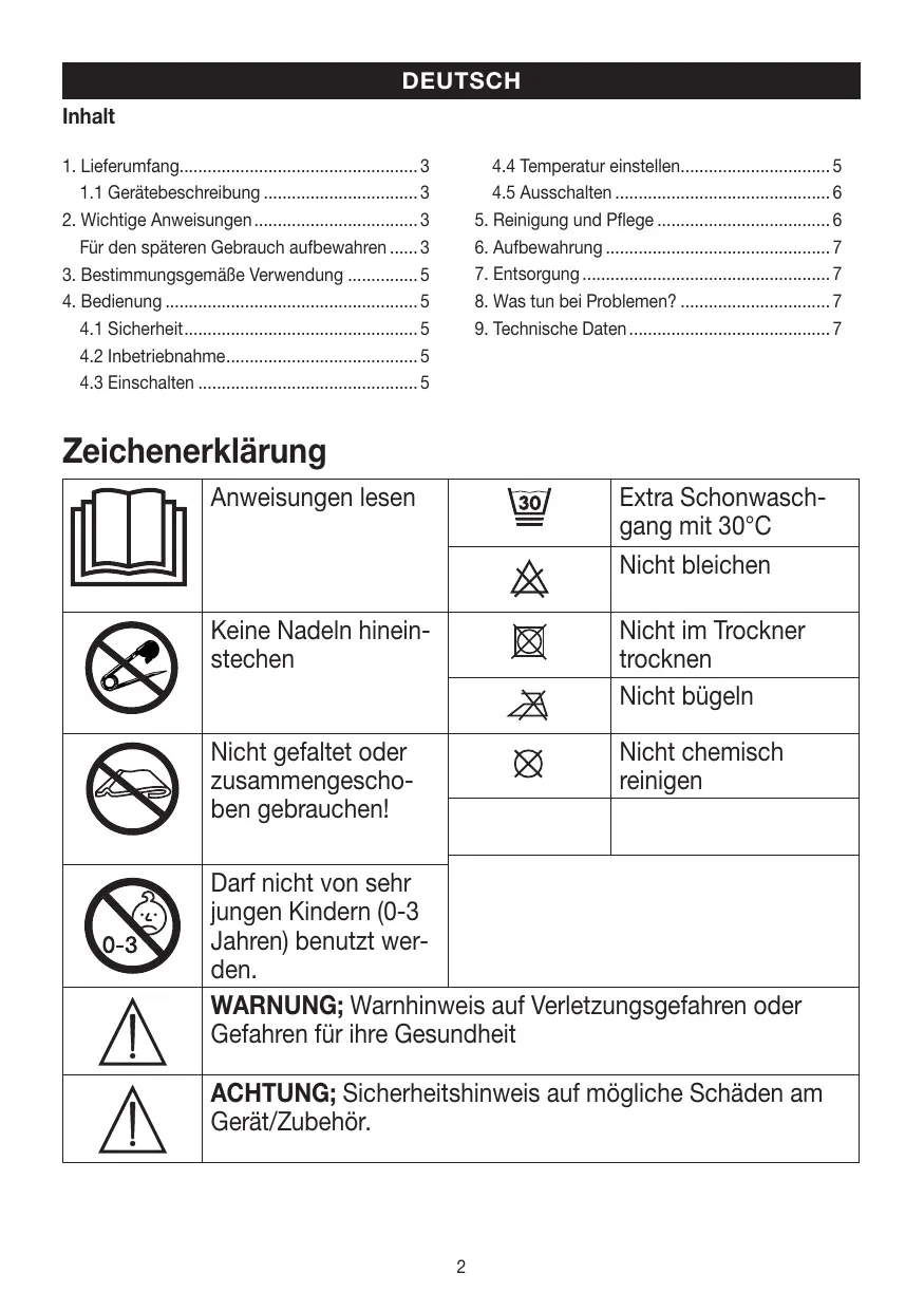 + Les champs électriques et magnétiques émanant de ce chauffe- matelas électrique peuvent éventuellement perturber le fonctionnement des stimulateurs cardiaques. Ils sont pourtant bien inférieurs aux limites : puissance des champs électriques : 5 000 V/m max., puissance des champs magnétiques : 80 A/m max., induction magnétique : 0,1 mT max. Veuillez donc consulter votre médecin et le fabricant de votre stimulateur cardiaque avant d'utiliser ce chauffe-matelas.