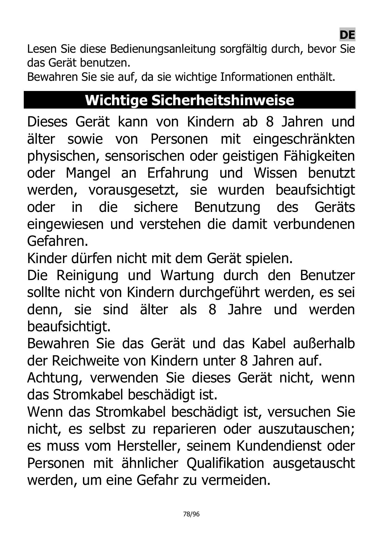 Die Reinigung und Wartung durch den Benutzer sollen nicht von Kindern durchgeführt werden, es sei dessen, sie sind alter als 8 Jahre und werden beaufsichtigt.